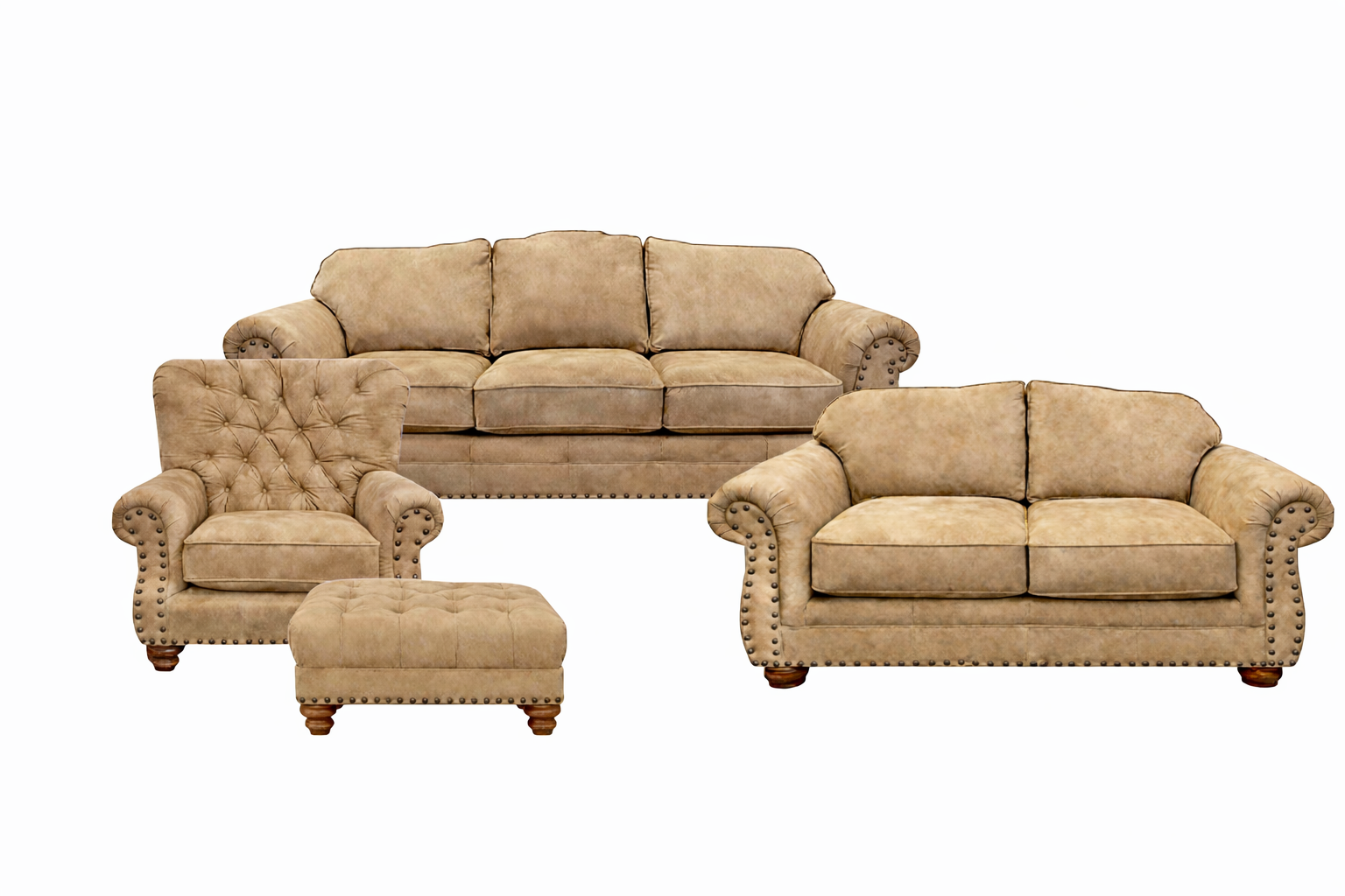 Conjunto de salón de 4 piezas Open Range Broken Stone de Mayo: sofá, sillón doble, sillón y otomana 100 % de cuero. Fabricado en Texas.