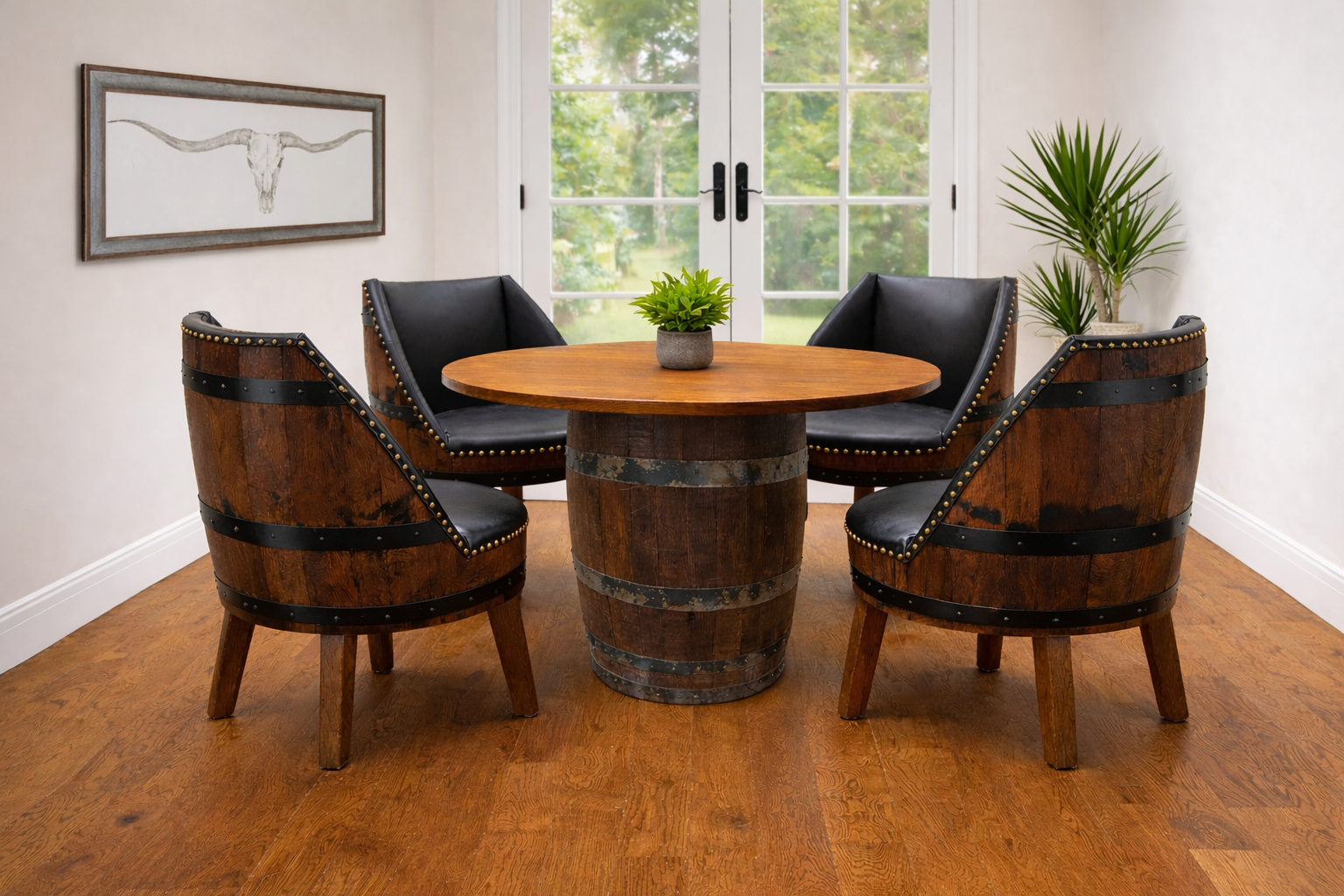 - Madera recuperada sostenible y ecológica: el barril de whisky recuperado utilizado en esta mesa se fabricó con duelas de roble blanco, mientras que el tablero se construyó con madera de roble blanco americano de primera calidad, cortada en cuartos y cosechada de forma sostenible en bosques gestionados de manera responsable.