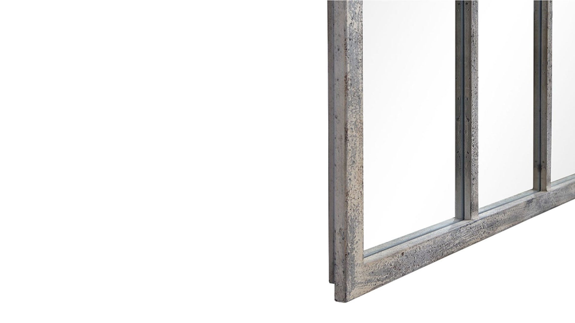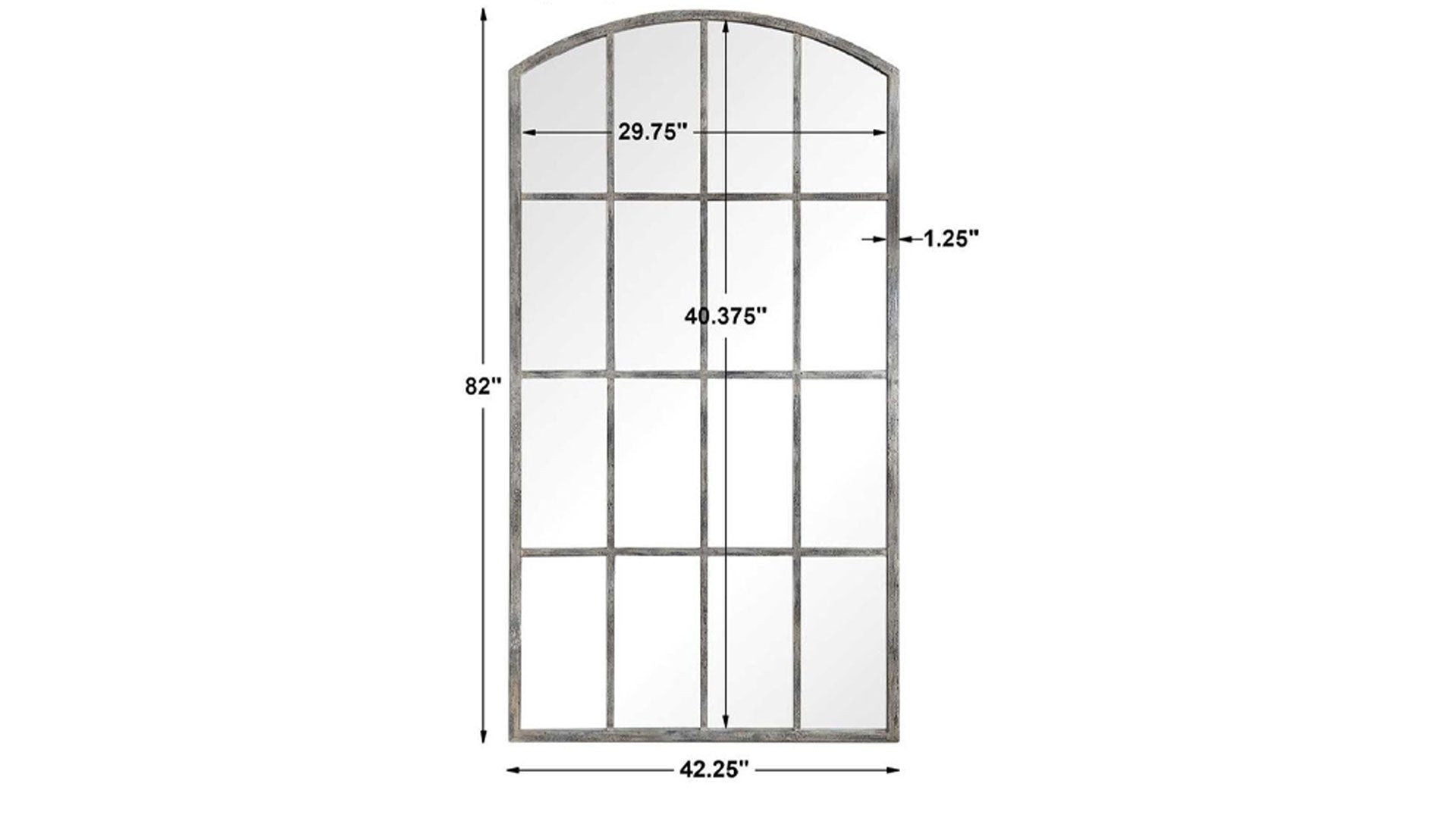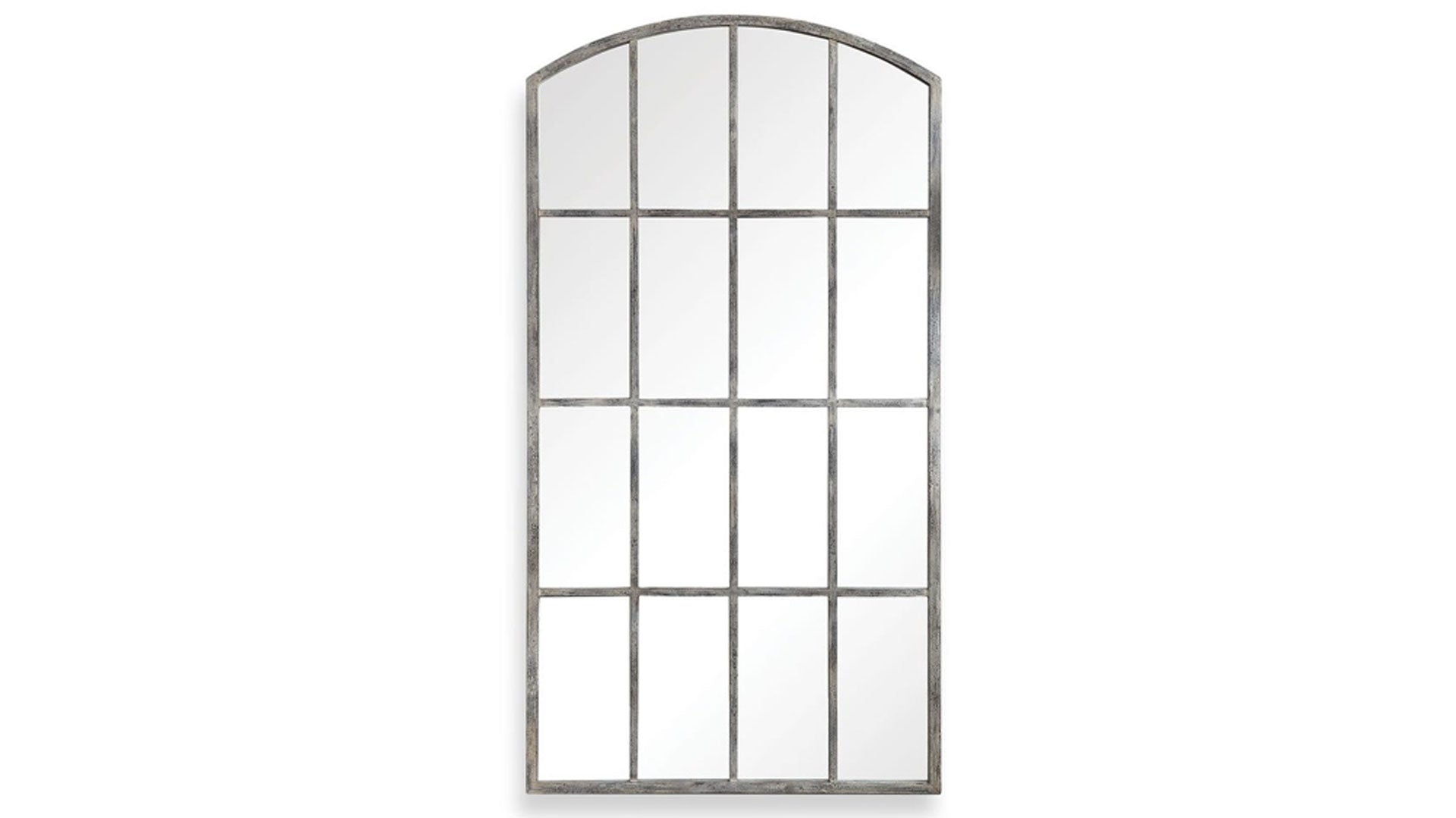 Los estilos contemporáneo y rústico francés se fusionan en este espejo arqueado. Con un aire que recuerda a una gran ventana, esta pieza presenta una estructura de hierro forjado a mano con un acabado gris óxido envejecido que ha sido desgastado y cubierto con un lavado en color blanco roto.