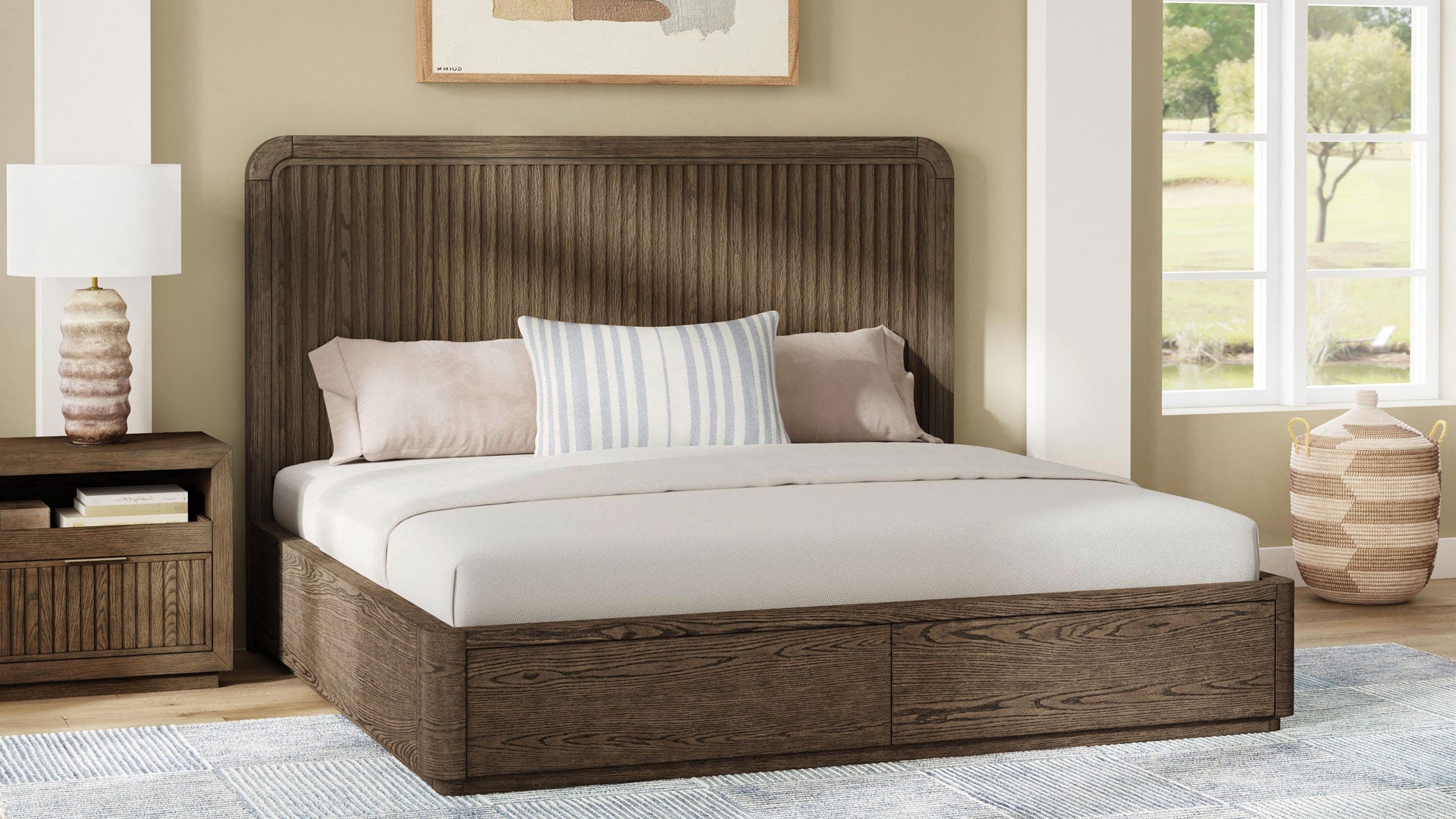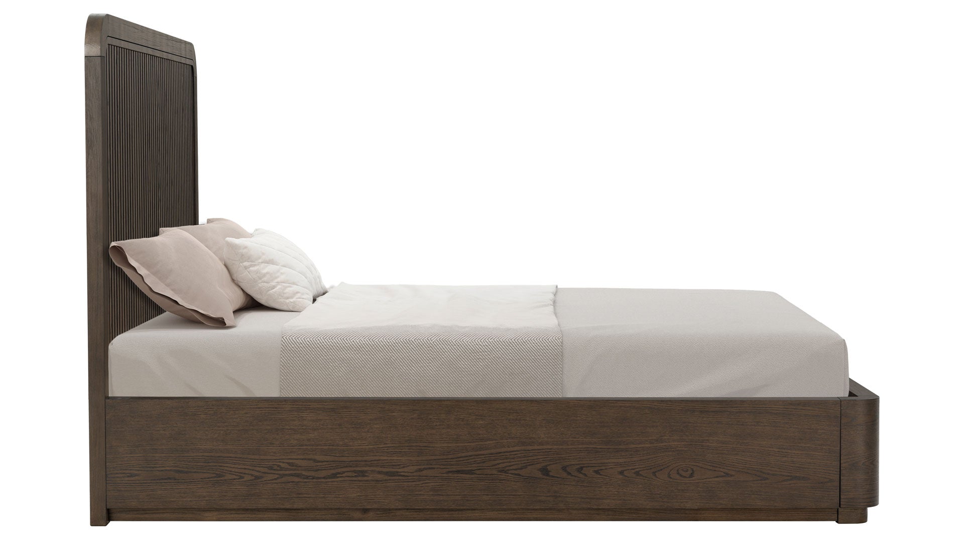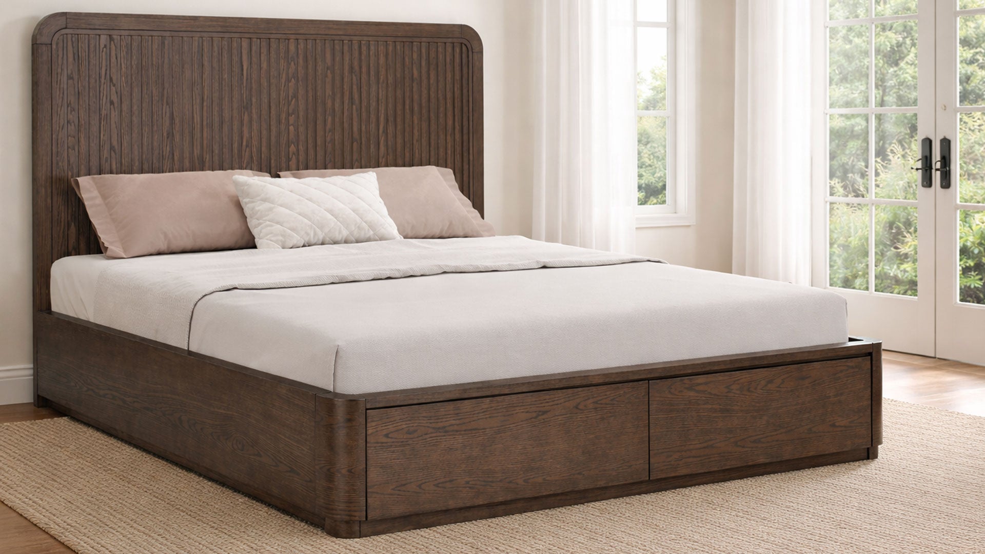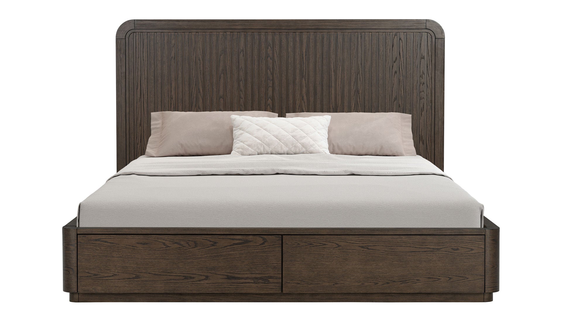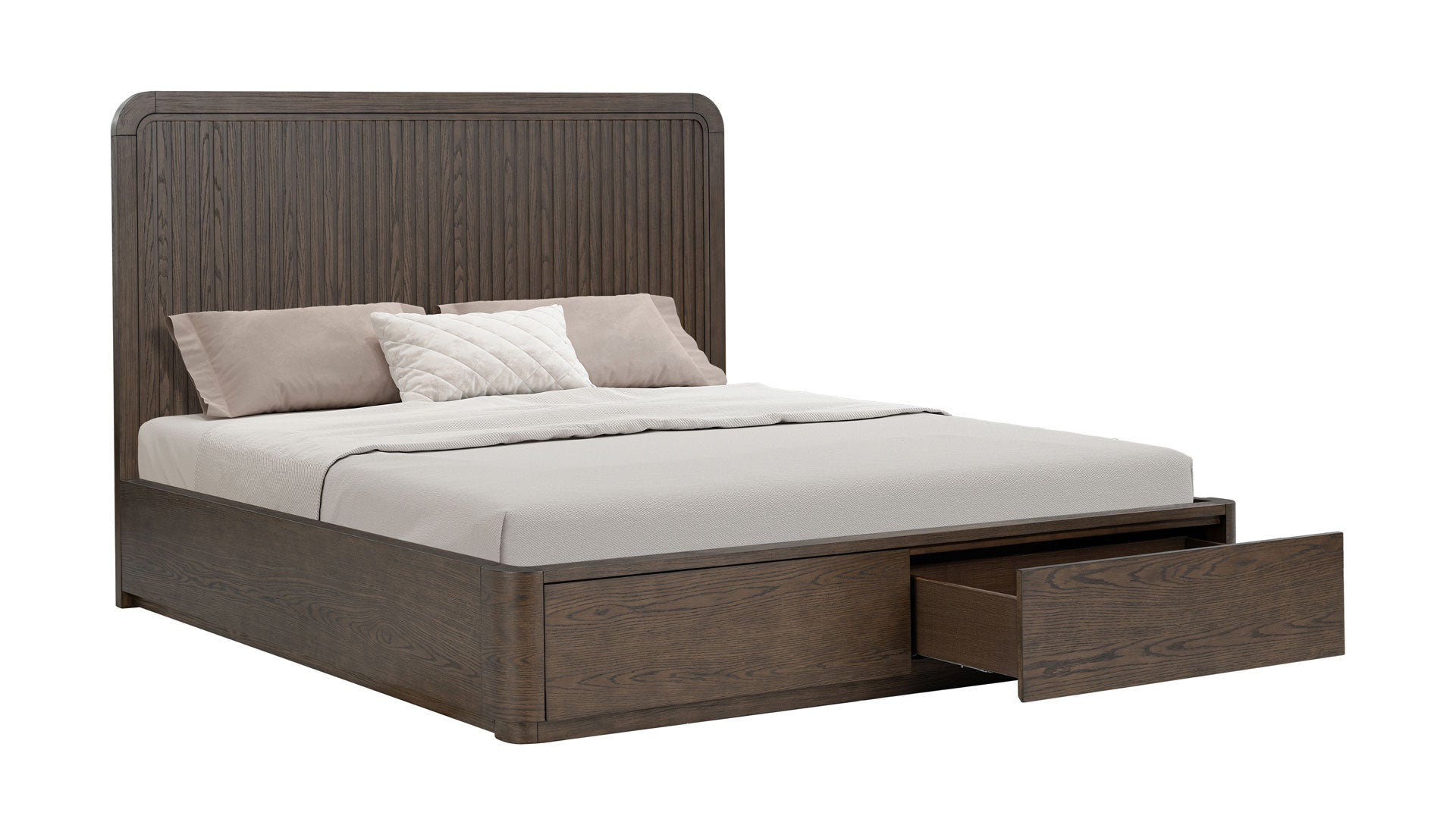 Al ser una cama de estilo plataforma, elimina la necesidad de un somier, lo que permite que destaque su aspecto minimalista y moderno. Los cajones de almacenamiento integrados debajo de la cama están perfectamente integrados en el marco, lo que mantiene la apariencia limpia de la cama y añade funcionalidad práctica. Los frentes de los cajones son lisos y sin adornos, por lo que el almacenamiento parece intencionado en lugar de utilitario. El resultado es una cama que parece atemporal en lugar de moderna, que encaja igual de bien en un dormitorio moderno, transicional o incluso rústico. Está diseñada para anclar el espacio, envejecer con elegancia y comunicar discretamente la calidad a través de los materiales y las proporciones, en lugar de llamar la atención.