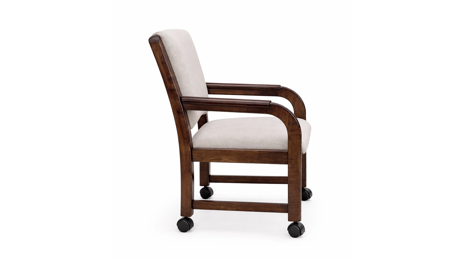 La silla Belfry Side Chair cuenta con un asiento y respaldos totalmente acolchados, tapizados en untejido de poliéster de alta calidad con un aspecto de lino natural elegido por su durabilidad, suavidad y facilidad de cuidado. El respaldo suavemente contorneado y el generoso acolchado proporcionan una comodidad duradera para comidas prolongadas, reuniones o conversaciones.Los brazos de madera maciza, lisos y esculpidos, añaden soporte y refuerzan las proporciones equilibradas de la silla. Las ruedas discretamente integradas permiten moverla fácilmente sin sacrificar la elegancia, lo que la hace especialmente práctica para mesas de comedor, mesas de juego o salas polivalentes. Las ruedas tienen un tamaño cuidadosamente estudiado para mantener una apariencia sólida y elegante, en lugar de un aspecto utilitario.