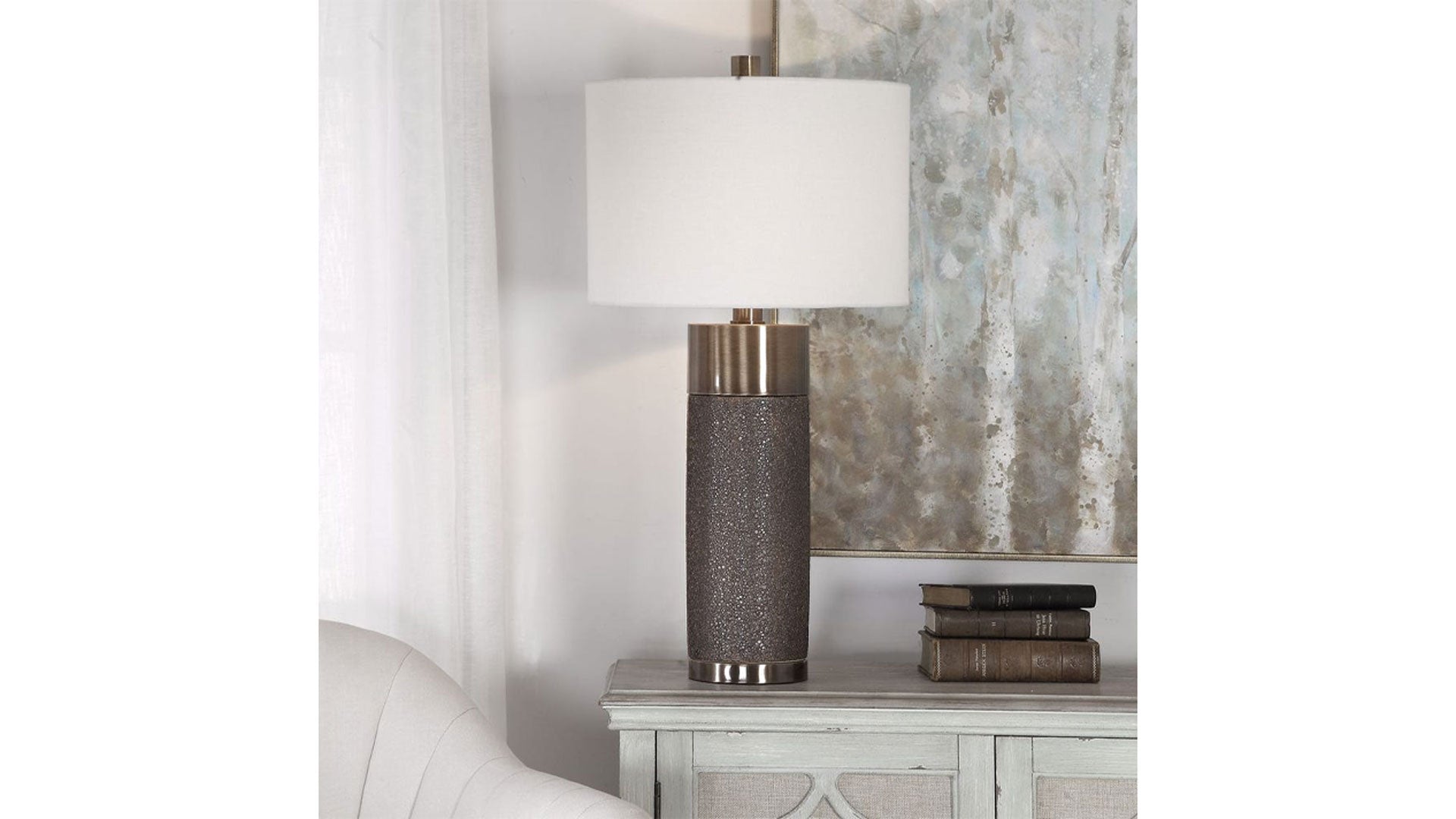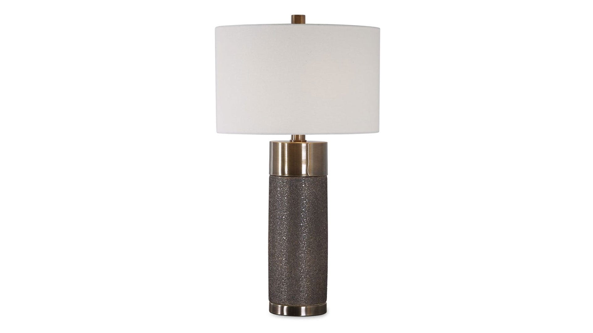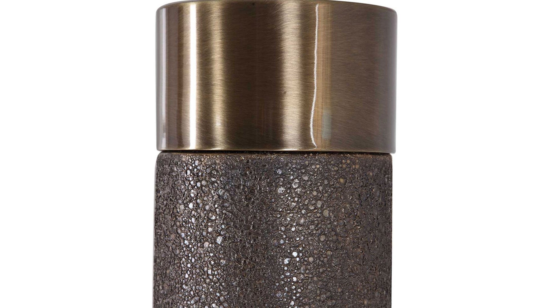 El diseño contemporáneo de esta lámpara de mesa destaca por su base de cerámica con gran textura y acabado en bronce dorado metalizado, combinada con detalles de hierro chapado en latón antiguo. Una pantalla cilíndrica rígida de tela de lino blanco roto completa esta pieza.
