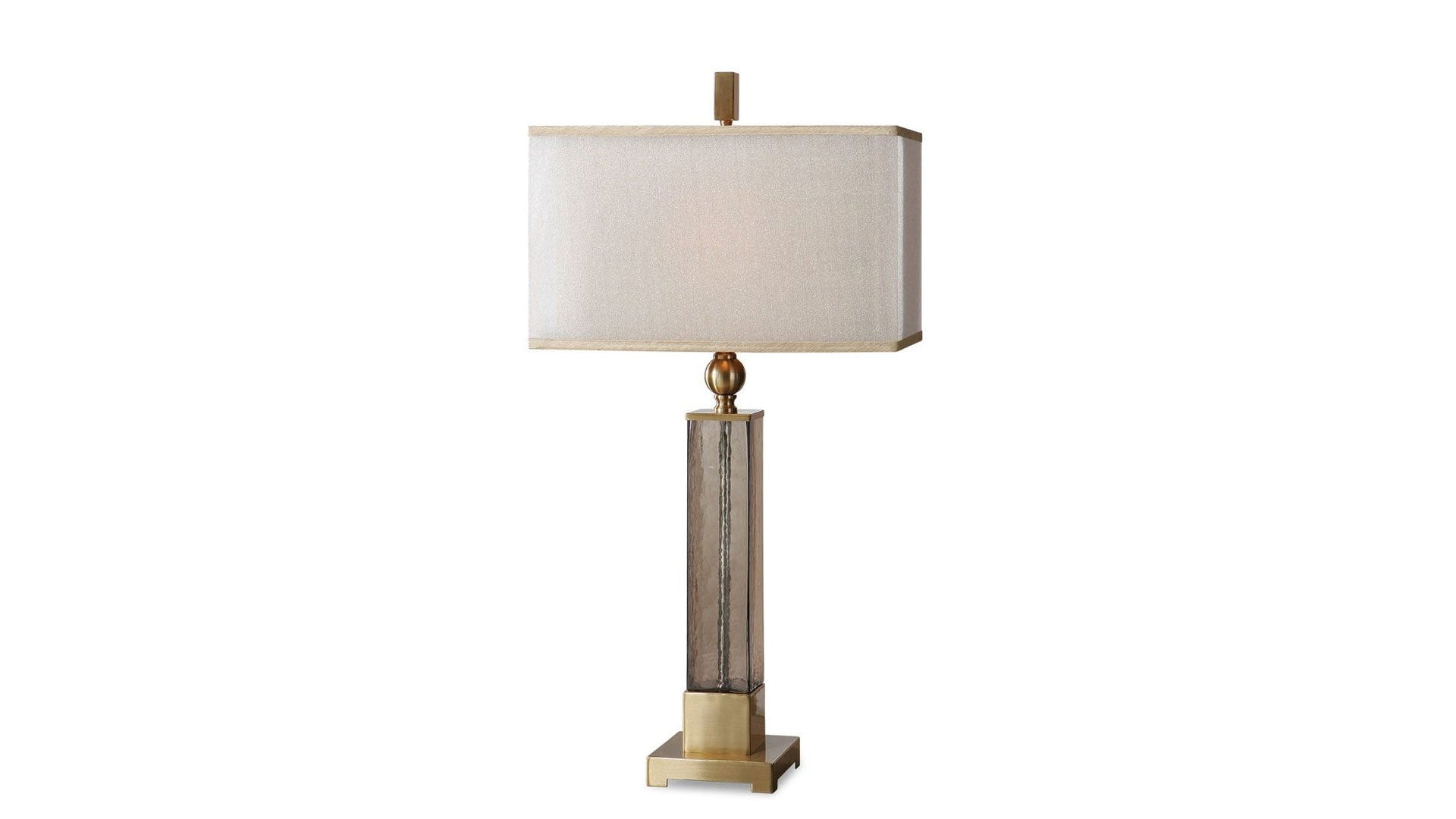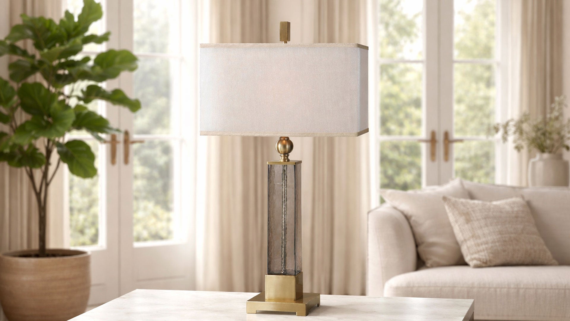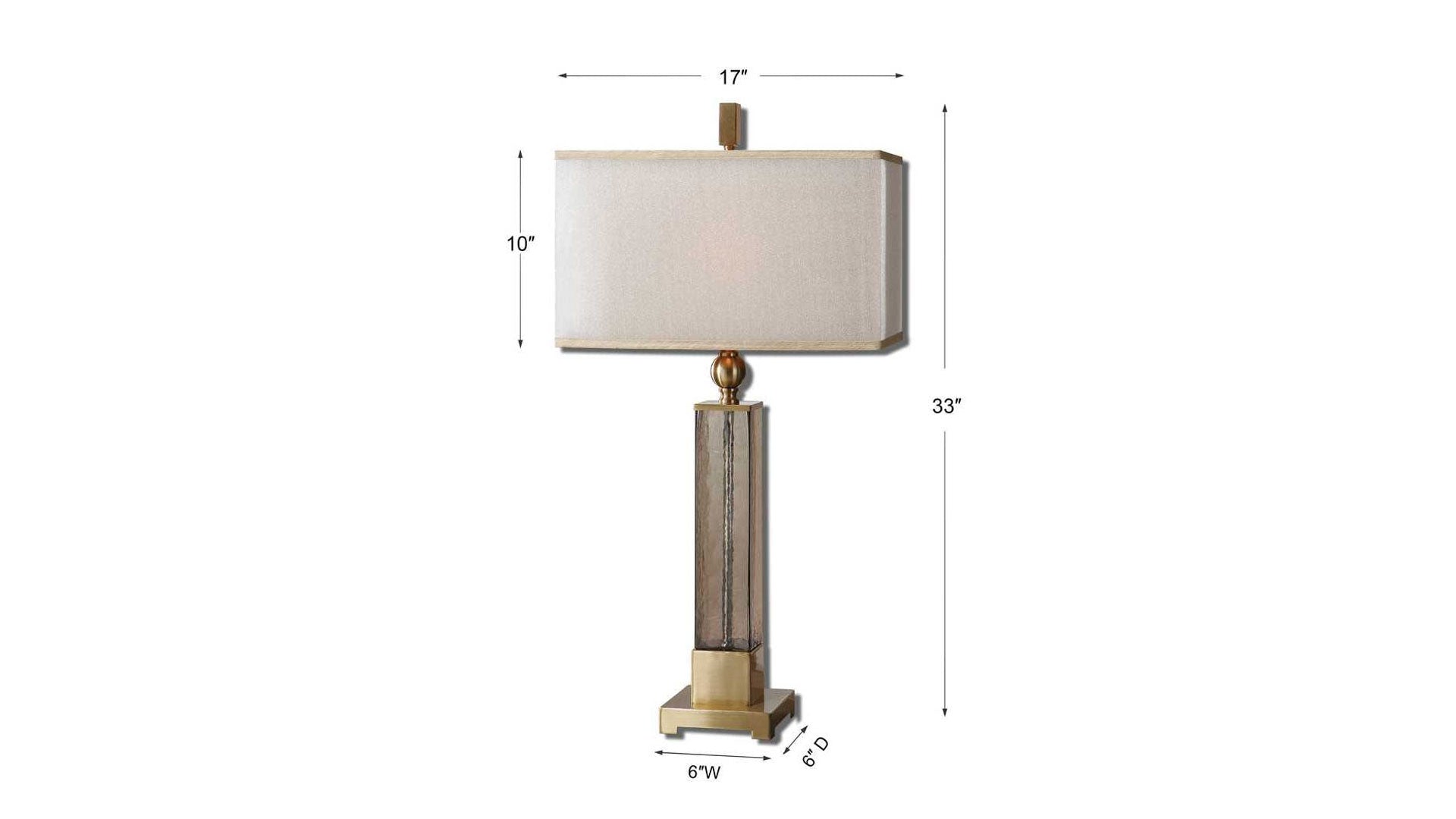 Vidrio ámbar claro texturizado, realzado con detalles chapados en latón cepillado. Las pantallas de doble rectángulo con estructura rígida presentan una pantalla interior en color champán dorado y una pantalla exterior transparente y sedosa en tono champán cálido.