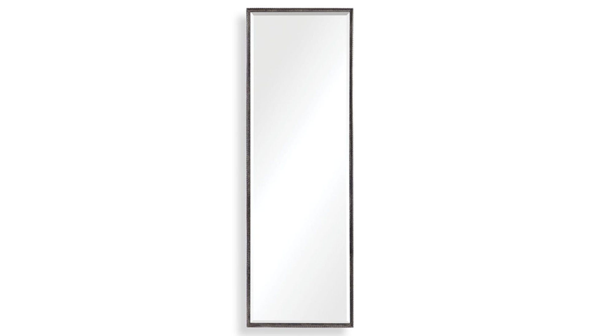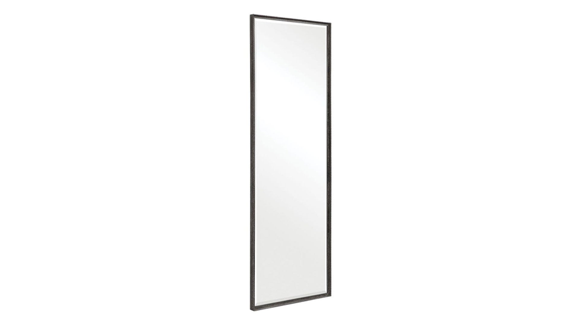 Este sencillo espejo de tocador presenta una estructura de hierro con bordes detallados. El marco de perfil ligero tiene un acabado en negro rústico desgastado con reflejos champán envejecido. Se puede colgar en horizontal o en vertical.