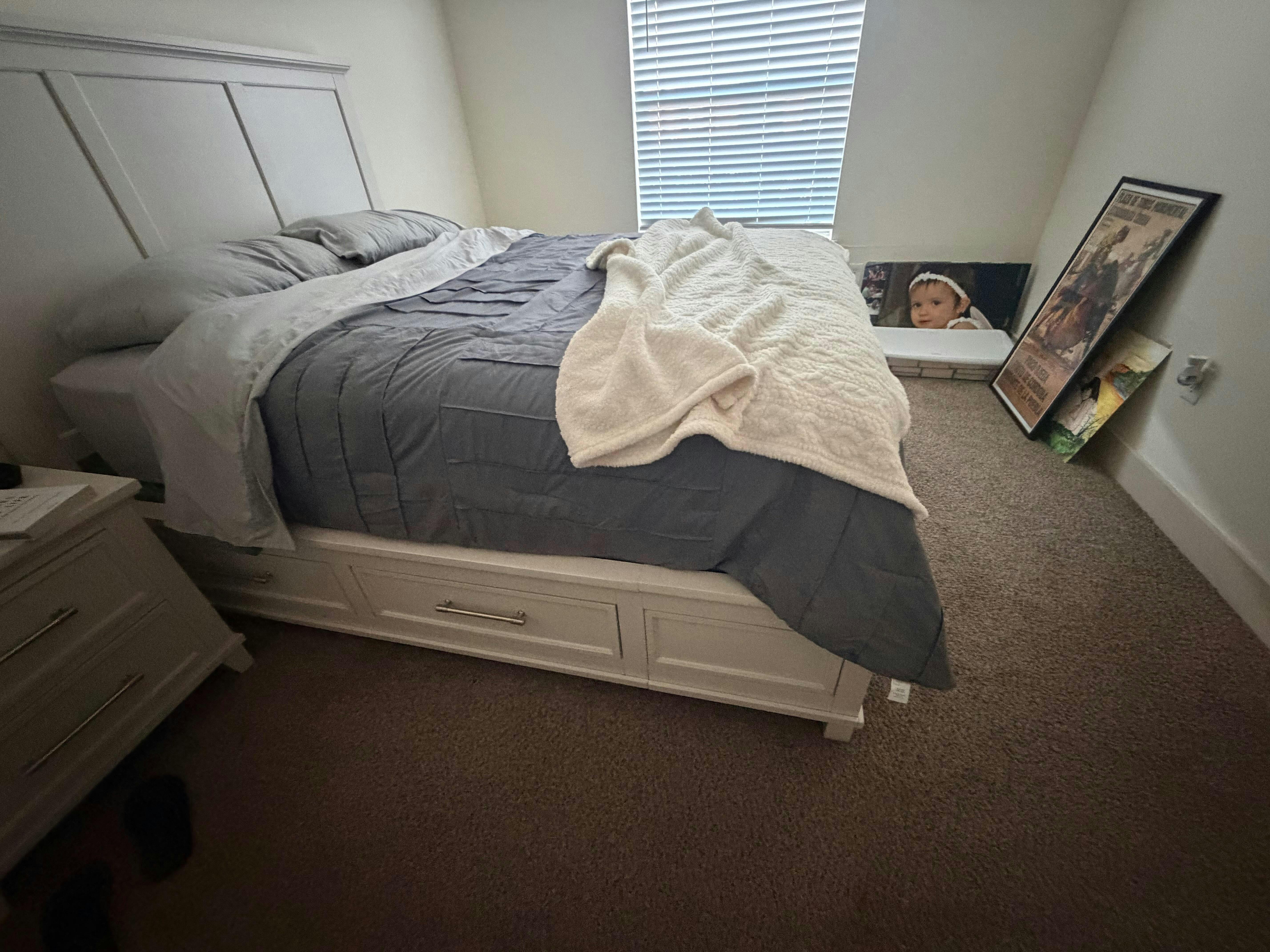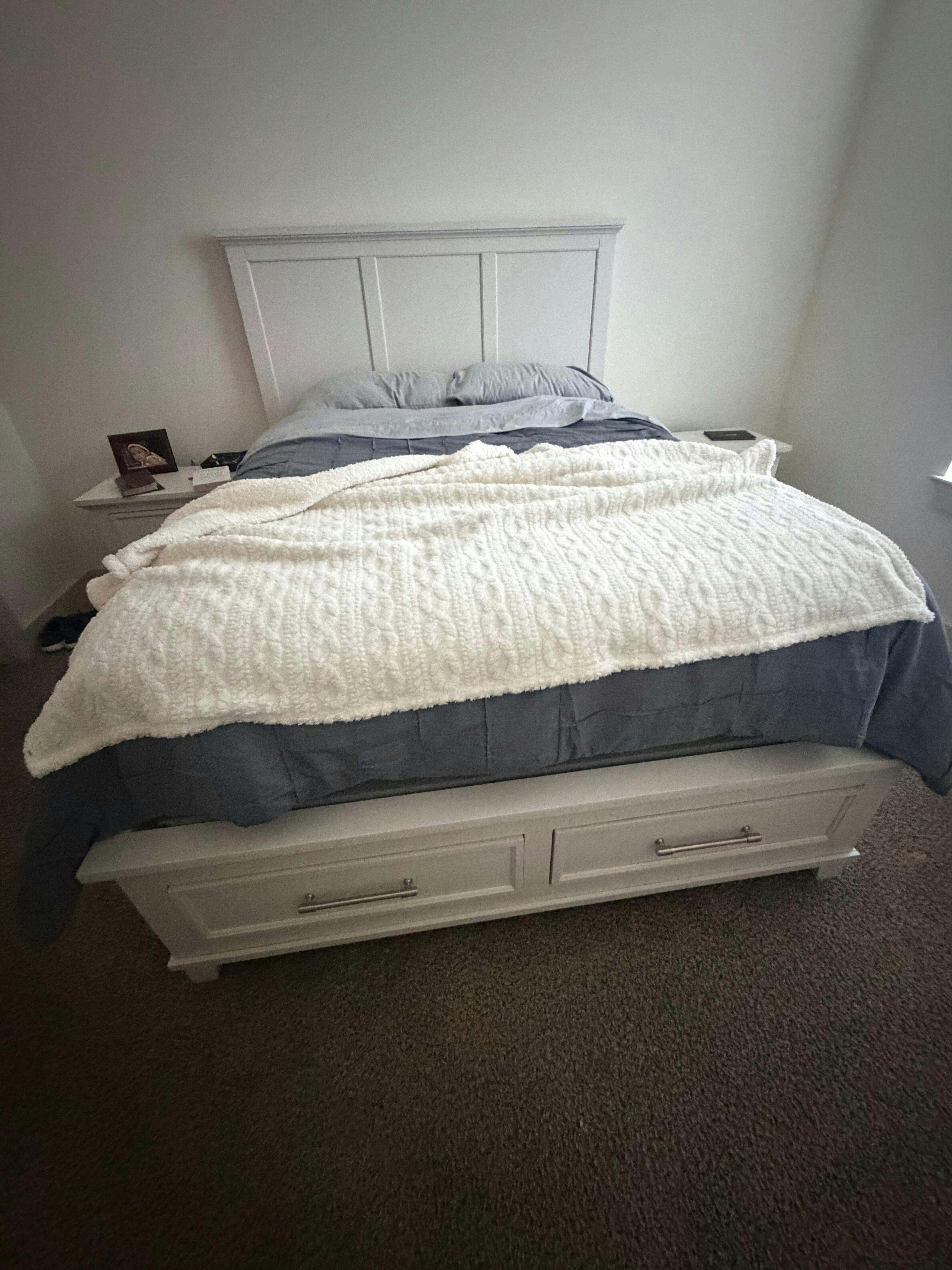Aporte un toque de elegancia a su dormitorio con esta cama en acabado marfil, con paneles biselados empotrados, tiradores de níquel cepillado y seis amplios cajones de almacenamiento para una mezcla de estilo refinado y organización práctica.