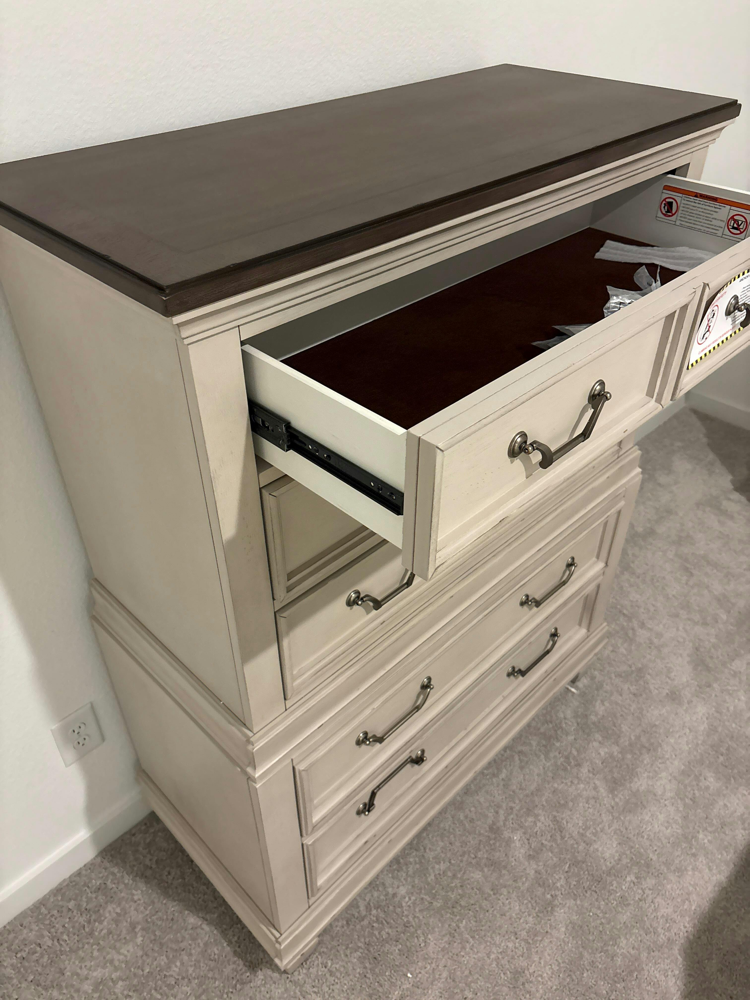 Descripción: Esta elegante cómoda de 5 cajones presenta un llamativo acabado en dos tonos, con una rica tapa marrón y un cuerpo blanco desgastado que emana un encanto shabby chic. El pecho está adornado con hardware de metal elegante, que combina la funcionalidad con una estética vintage atemporal que añade carácter a cualquier dormitorio.