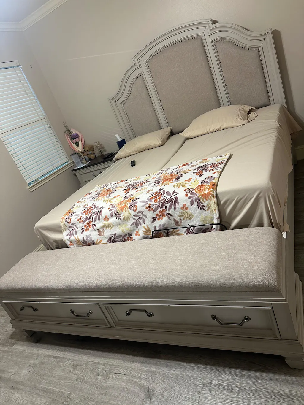 - Pata de cama tapizada tipo banco:pata de cama acolchada y tapizada en color perla, con dos cajones extraíbles con guías de rodamiento de bolas.