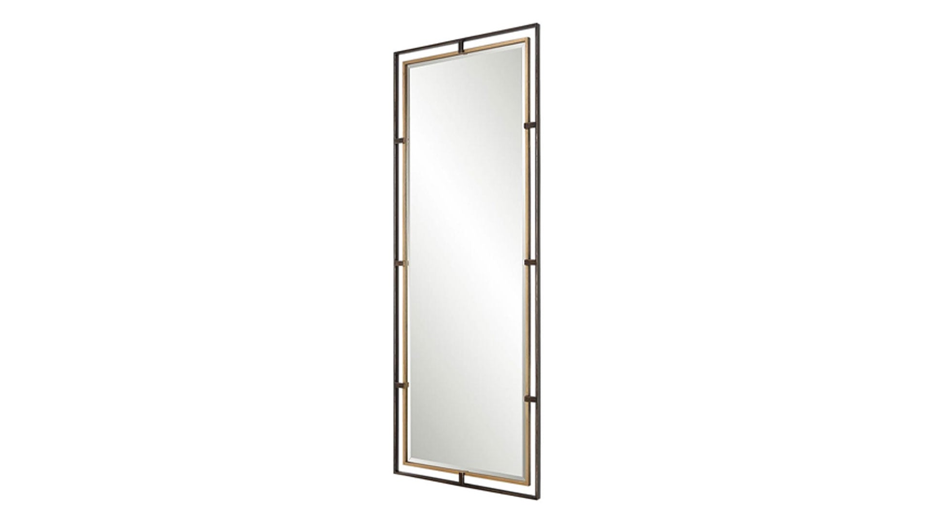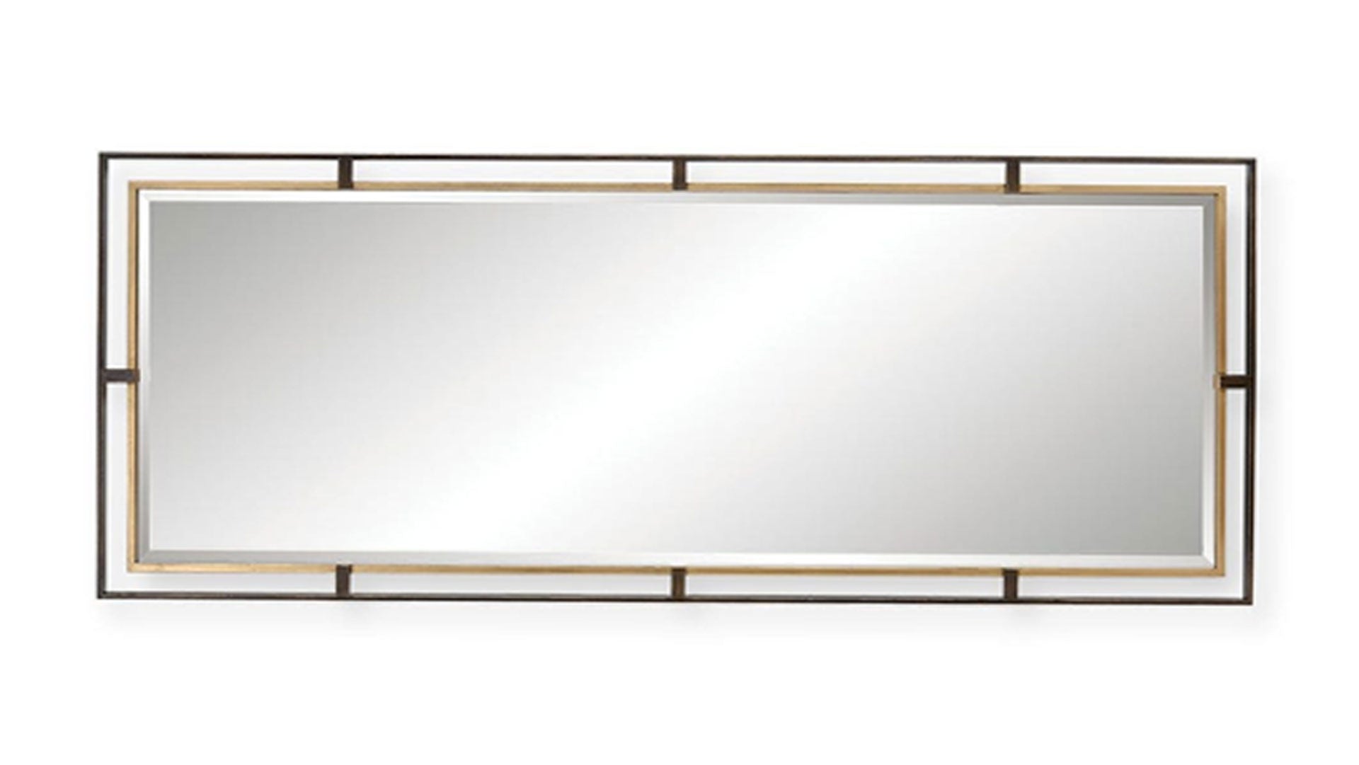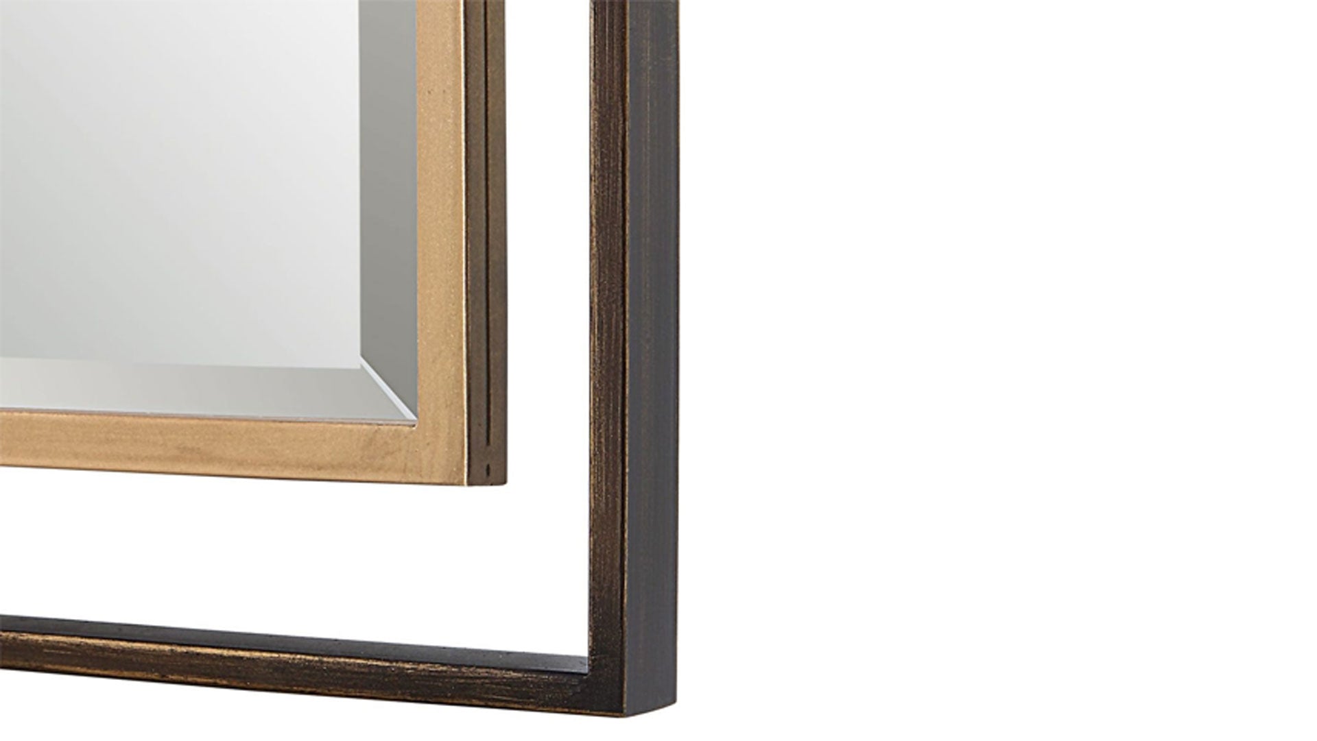 Este marco de hierro presenta un diseño tridimensional con un marco exterior acabado en bronce rústico envejecido, realzado por un marco interior ligeramente envejecido con pan de oro. Este espejo se complementa con un bisel de 1 1/4" y se puede colgar en horizontal o en vertical.