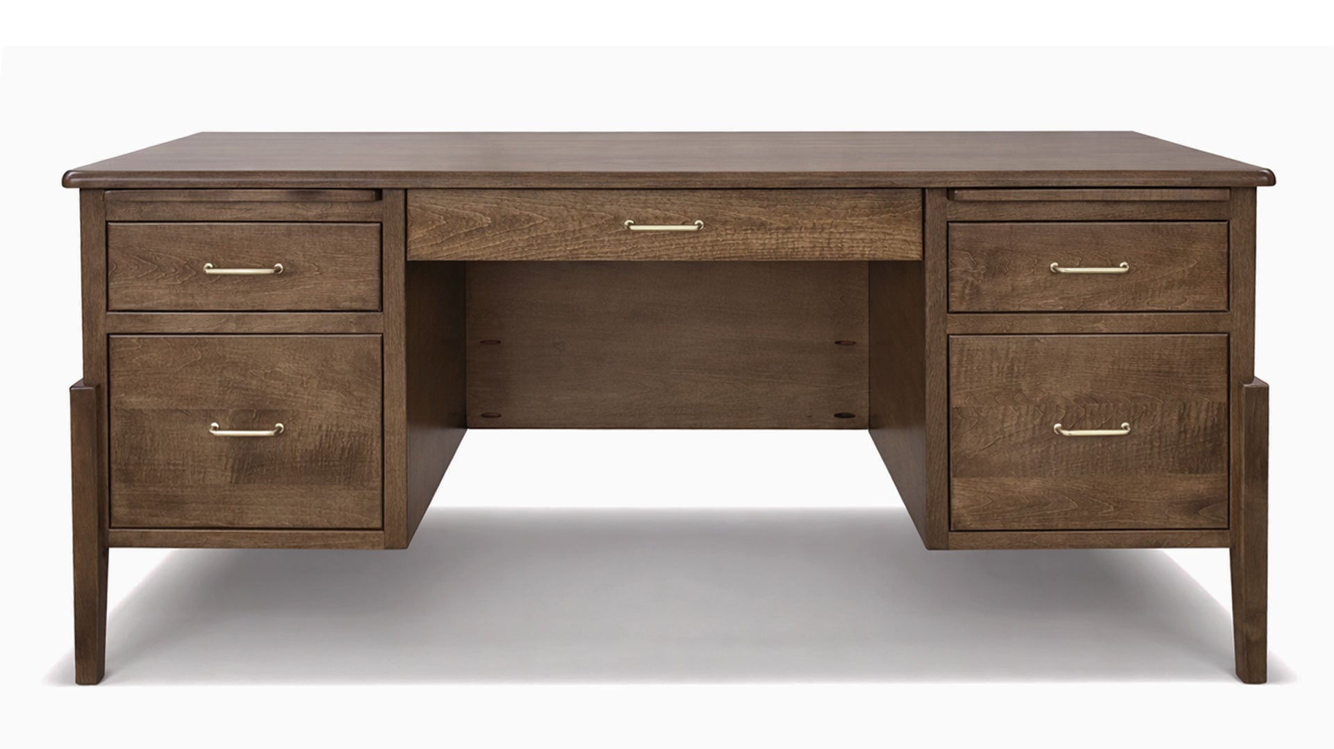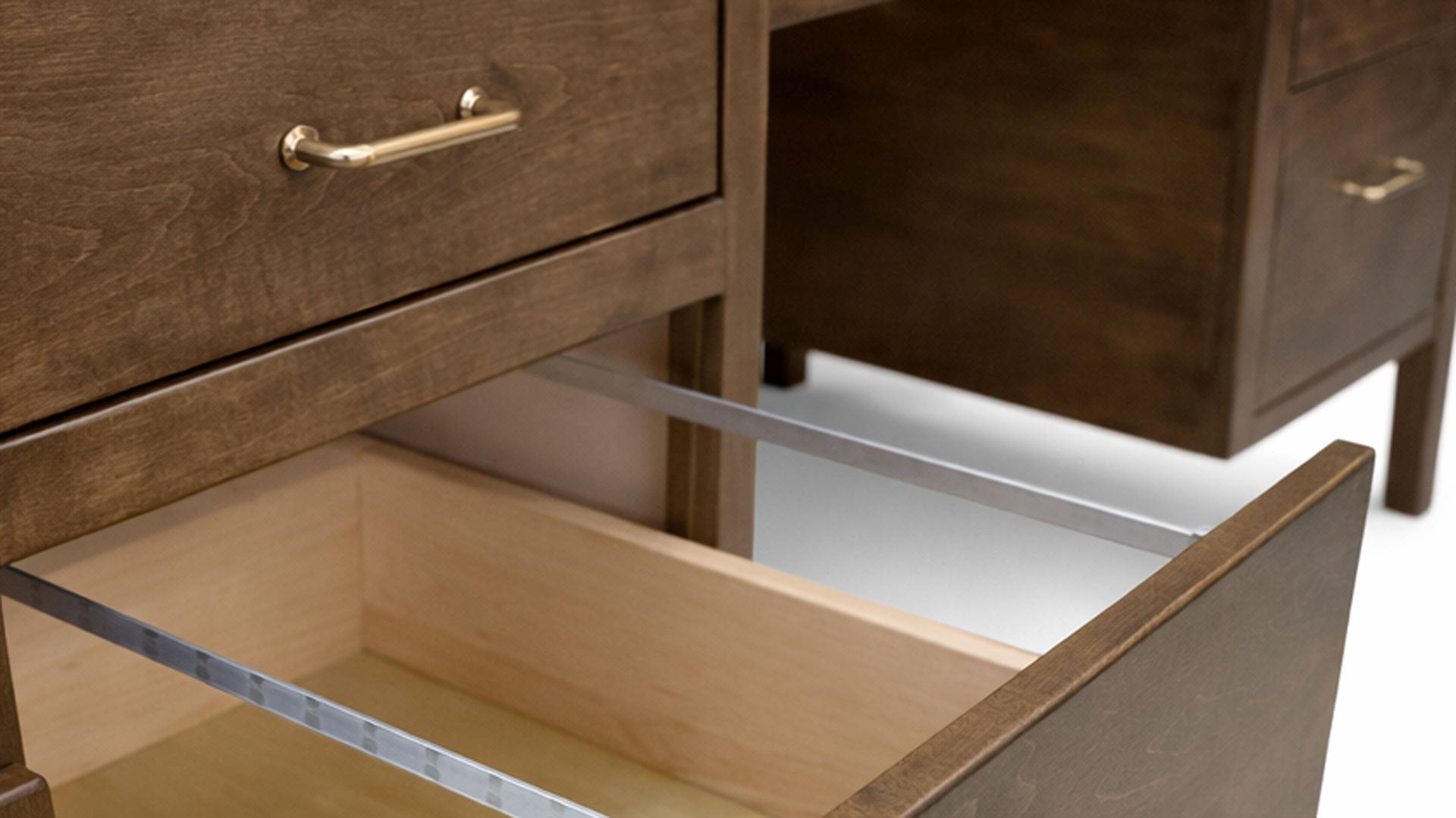 - Cajones en abundancia: todos los cajones son de cinco lados y con ensamblaje de cola de milano. Tres cajones poco profundos de madera de arce, dos cajones para archivos y dos escritorios extraíbles de arce.