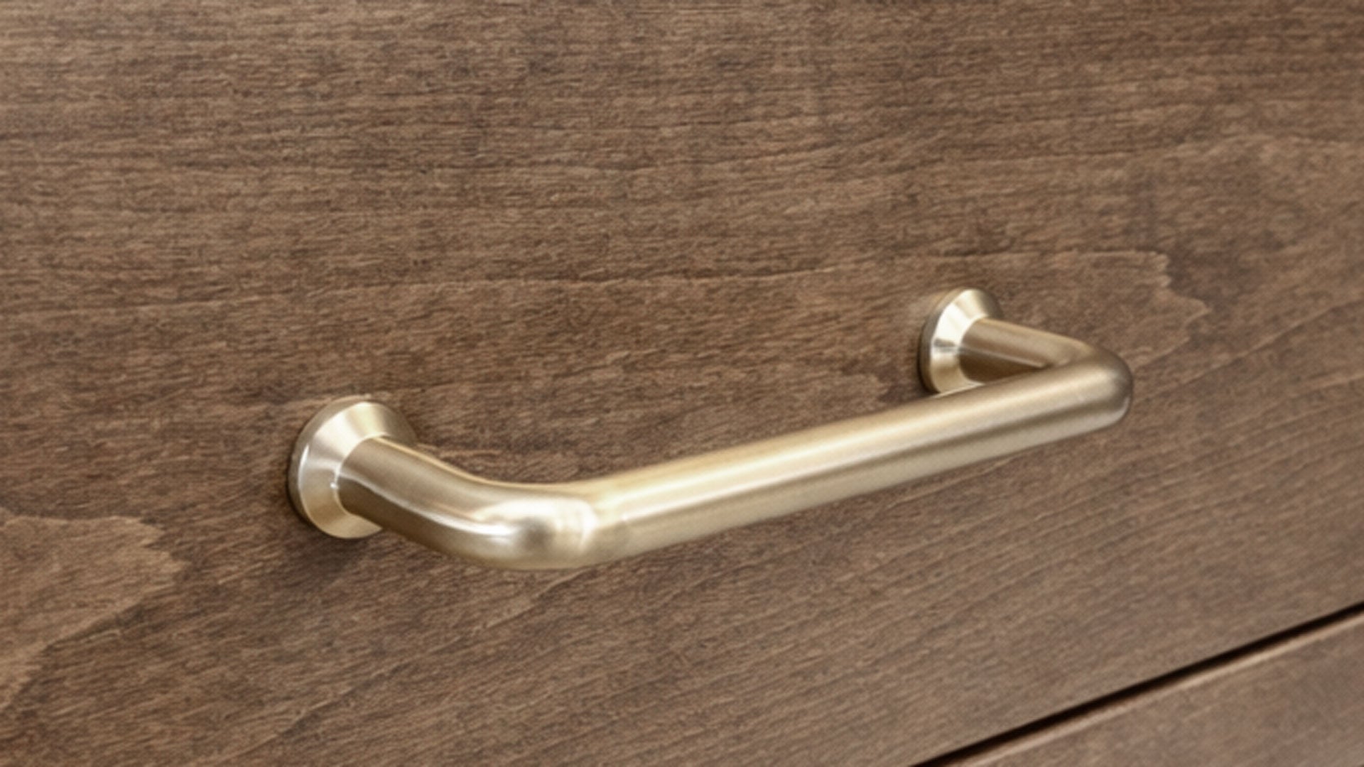 - Tiradores de bronce para cajones: Bonitos y prácticos, los tiradores de bronce para cajones complementan el tono almendra de la madera.