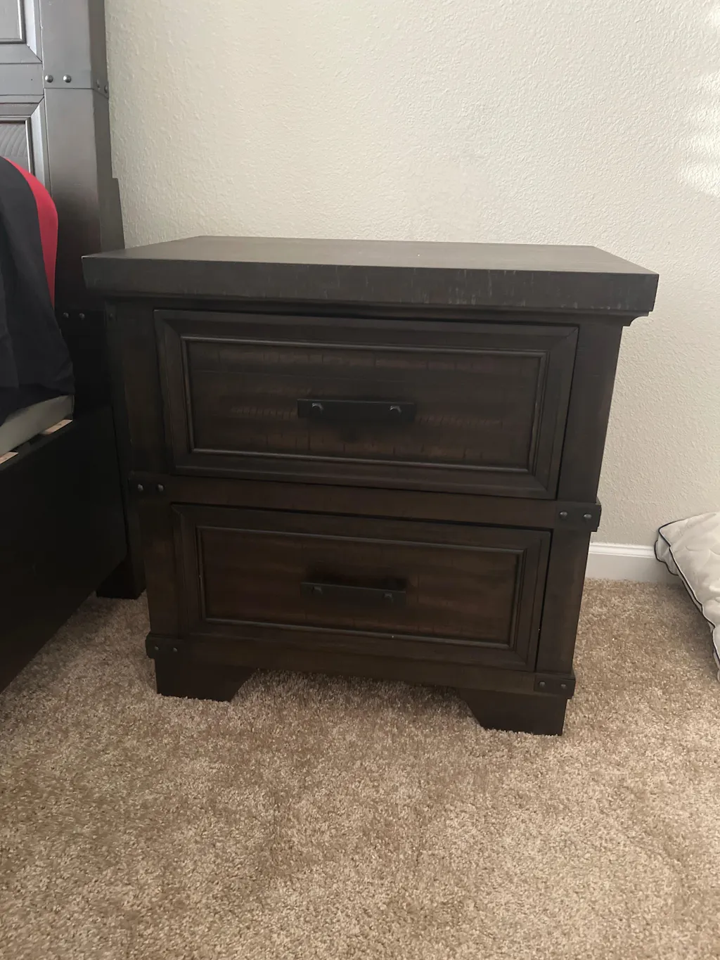 La mesilla de noche Colorado City combina el carácter clásico con la funcionalidad cotidiana, lo que la convierte en la compañera perfecta junto a la cama. La madera con acabado carbón realza el veteado natural para un aspecto cálido y distintivo, mientras que los detalles metálicos y los remaches añaden un toque industrial. Con dos amplios cajones para almacenamiento y un puerto USB integrado, esta mesilla de noche mantiene tus objetos esenciales organizados y tus dispositivos cargados, combinando a la perfección estilo y funcionalidad.