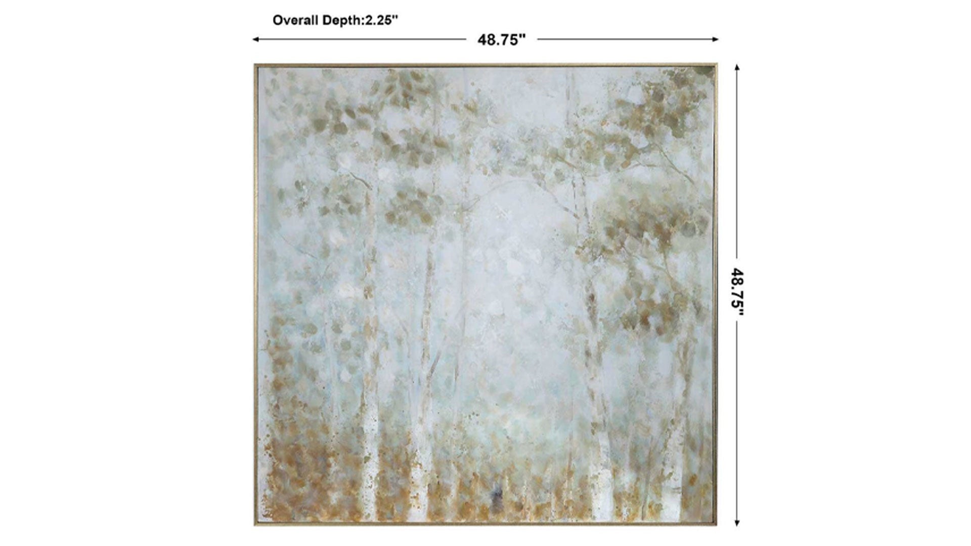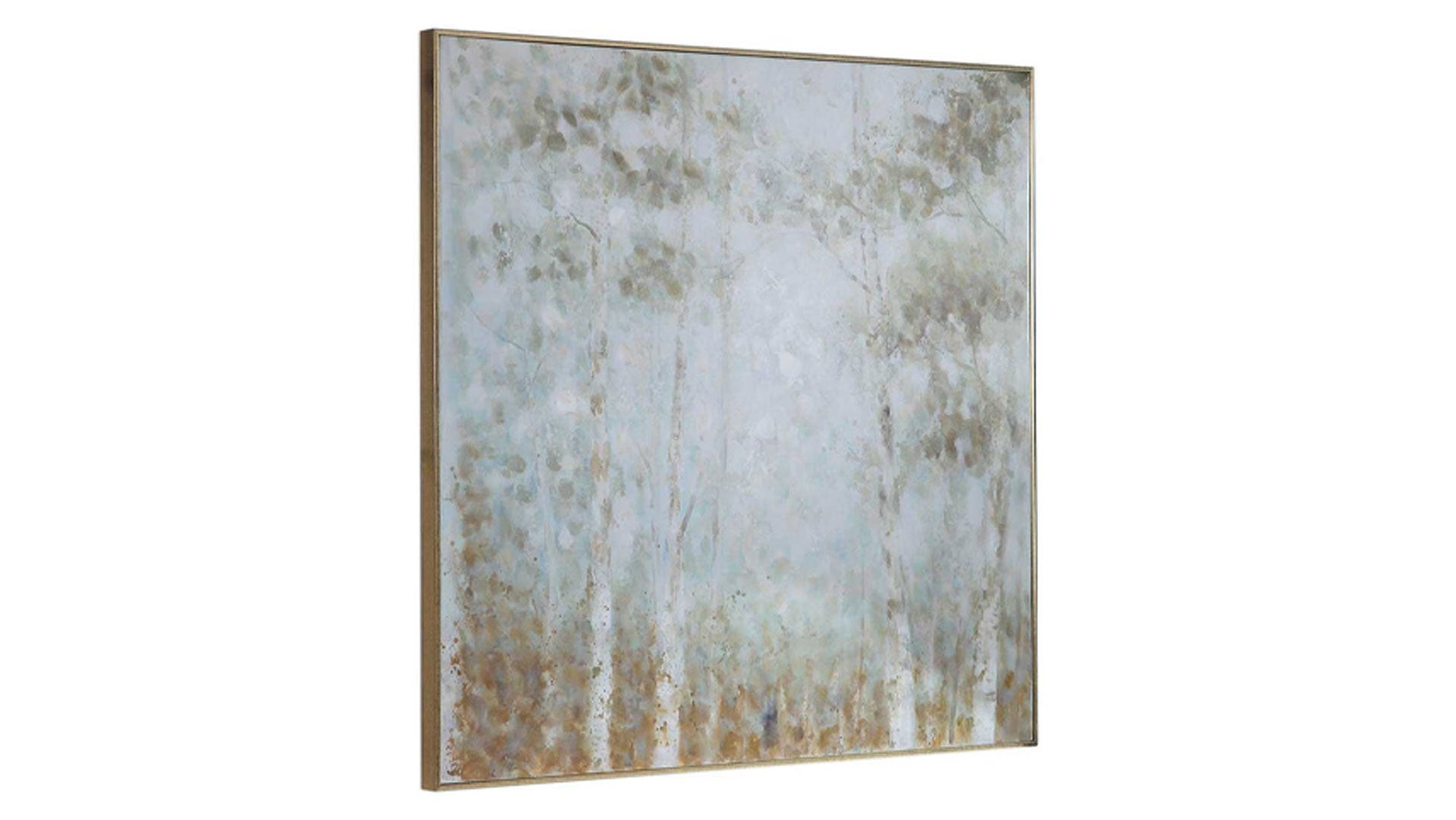 Esta obra de arte contemporánea, pintada a mano sobre lienzo, utiliza trazos suaves y delicados y una textura ligera para crear una relajante escena forestal. Se utilizan tonos suaves de blanco, gris, marrón claro y verde azulado para crear una obra de gran calidad, tranquila pero expresiva. Un marco de galería de plata antigua en tonos cálidos rodea la obra de arte. Debido a la naturaleza artesanal de esta obra, cada pieza puede presentar sutiles diferencias.