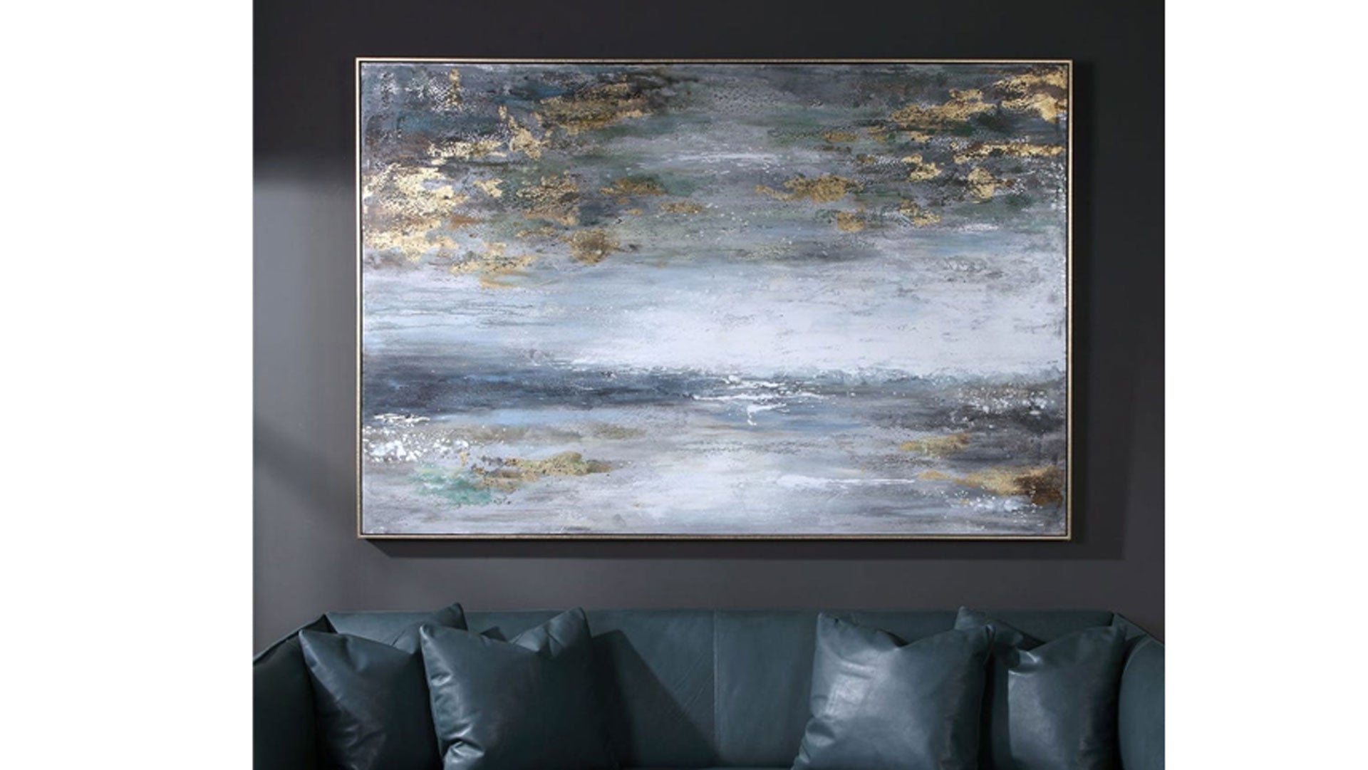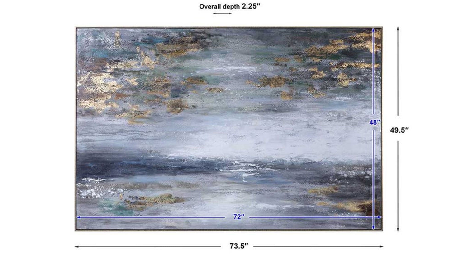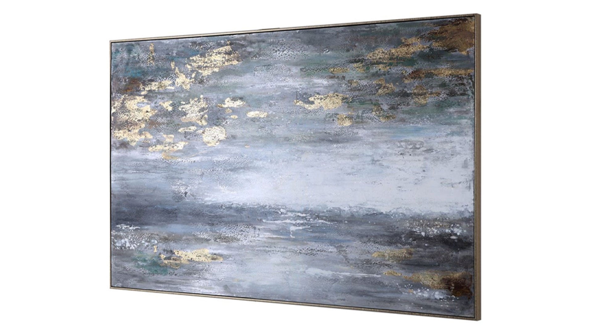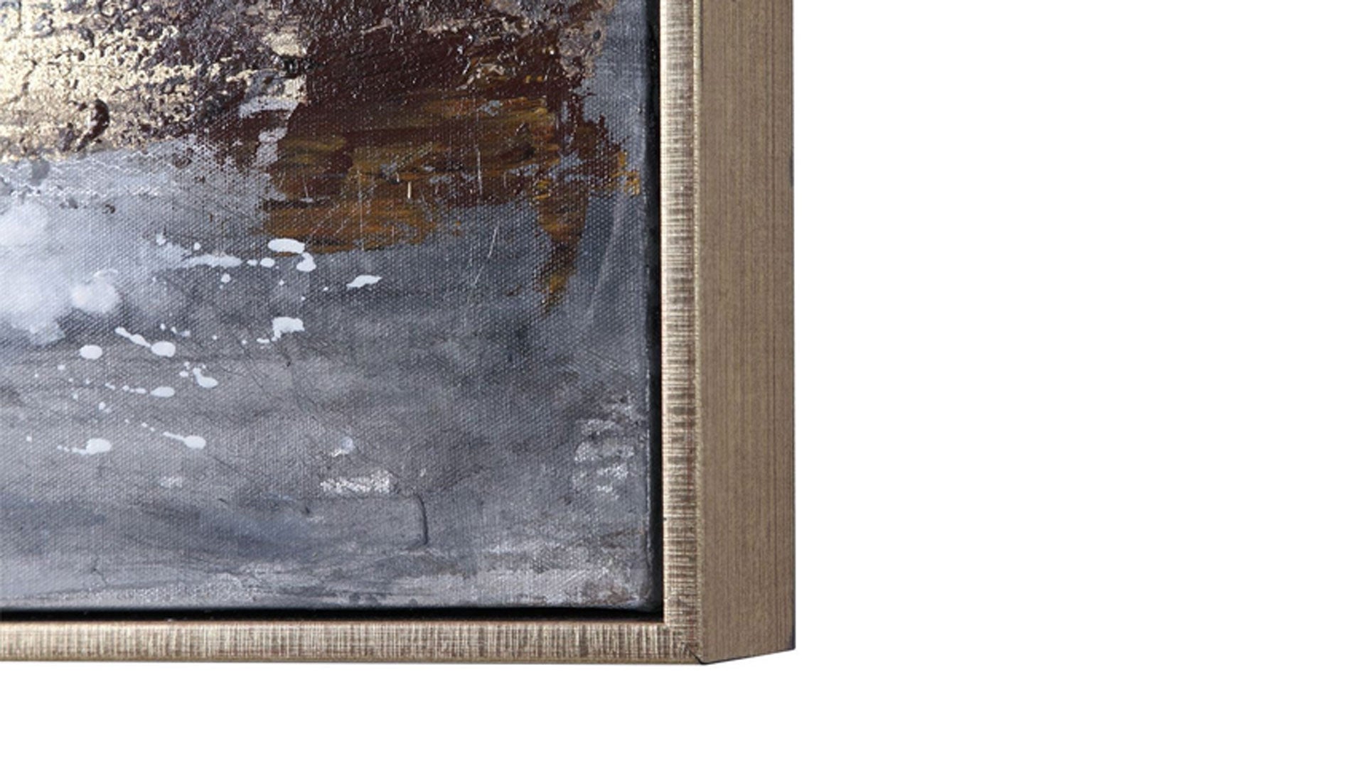 Los tonos melancólicos de gris y blanco se combinan para crear esta obra de arte abstracta que representa un paisaje. El lienzo pintado a mano está realzado por tonos carbón y pan de oro con sutiles detalles en verde y azul pizarra, y se combina con un marco dorado. Debido a la naturaleza artesanal de esta obra de arte, cada pieza puede presentar sutiles diferencias.