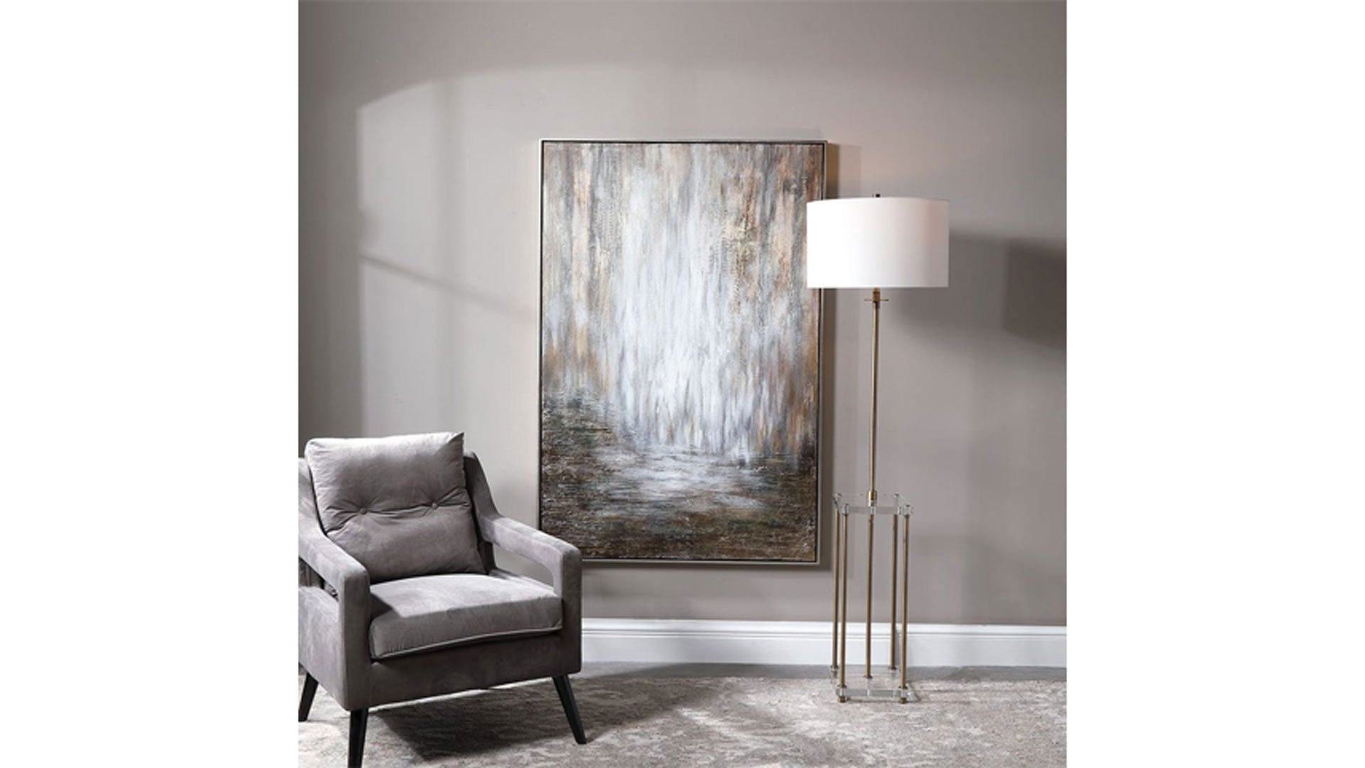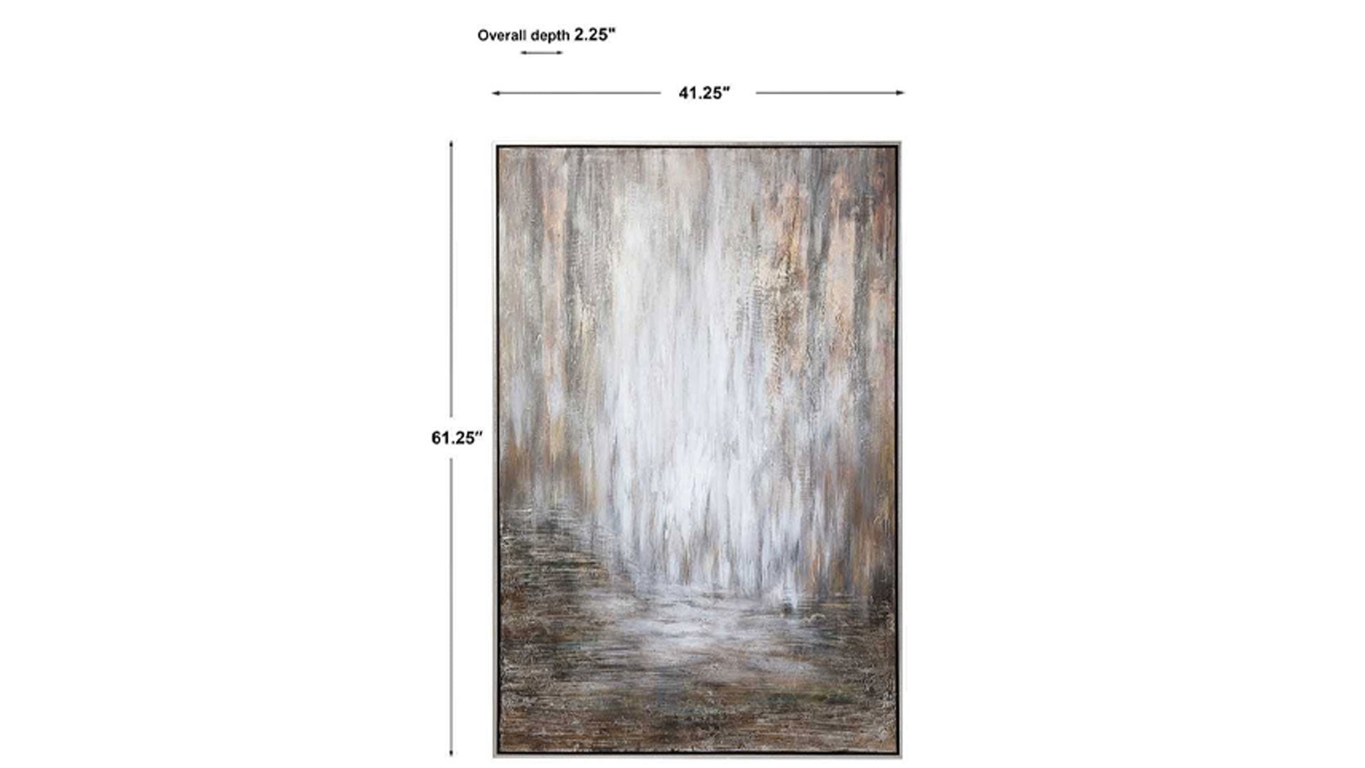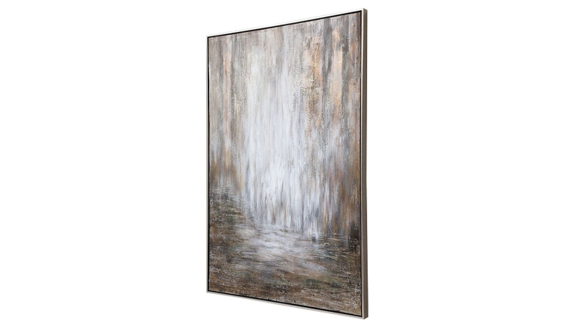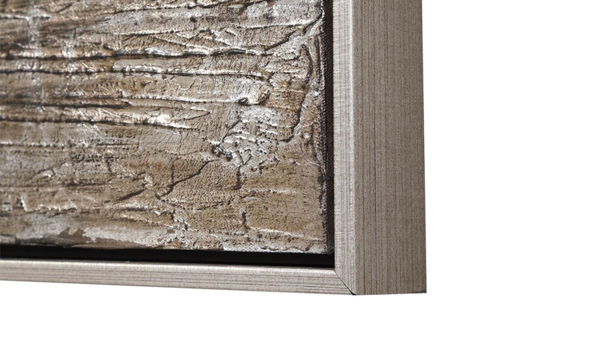 Los tonos bronce, dorado, plateado y gris hacen que esta versátil obra de arte sea muy fácil de colocar. La gama de colores neutros presentes en esta pieza pintada a mano se ve acentuada por una textura notable y un marco de galería plateado antiguo. Debido a la naturaleza artesanal de esta obra de arte, cada pieza puede presentar sutiles diferencias.
