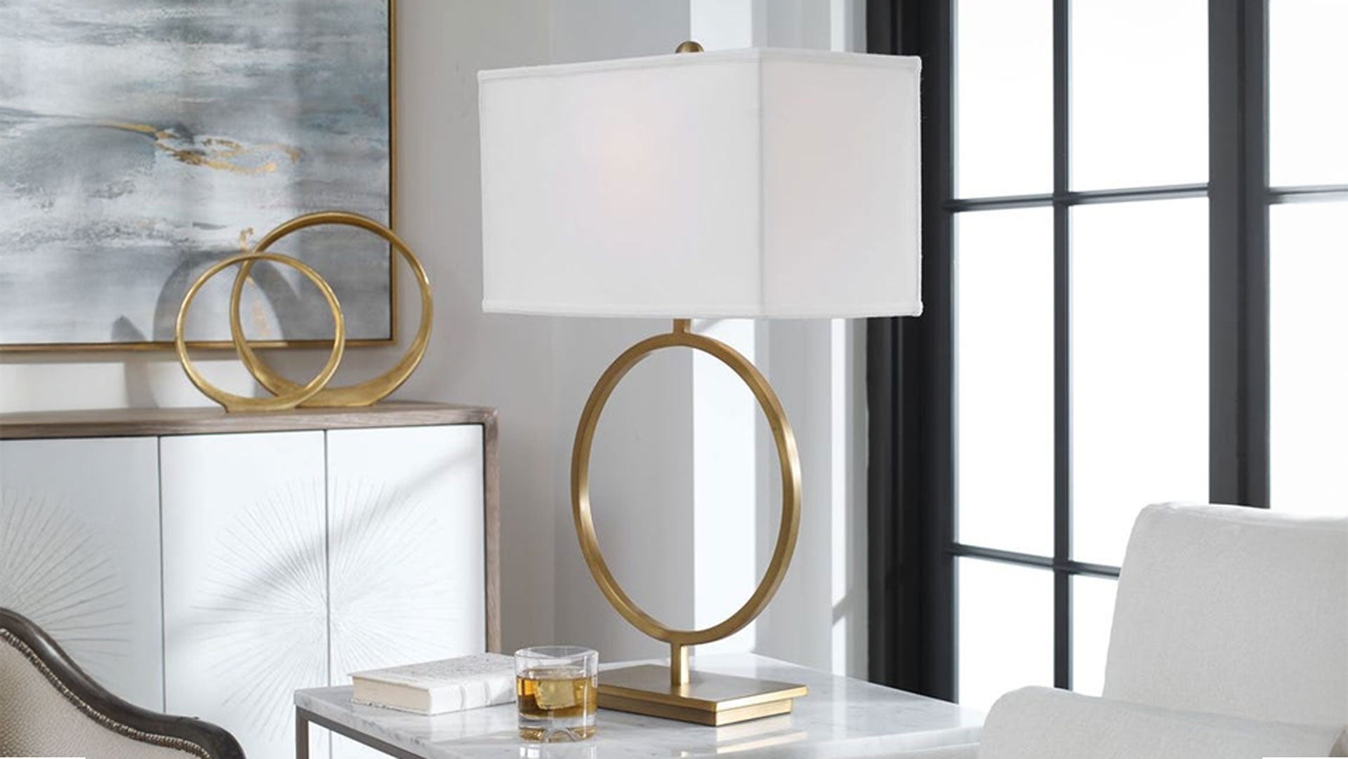 Lámpara de mesa Duara con base dorada y luz cálida – En stock | Gallery Furniture