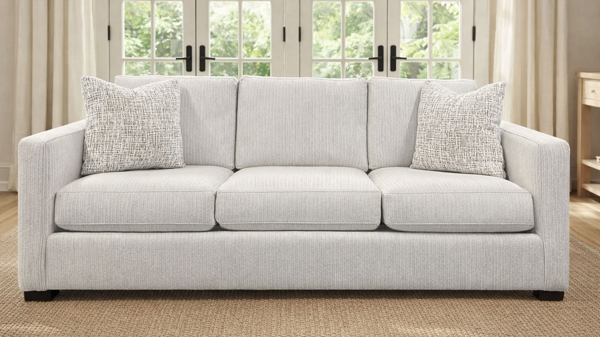 Este sofisticado sofá contemporáneo cuenta con una bonita tapicería neutra clara con una sutil textura lineal que añade profundidad e interés visual. Los brazos rectos y la silueta estilizada crean una estética moderna que complementa cualquier decoración, mientras que los mullidos cojines proporcionan una comodidad excepcional.