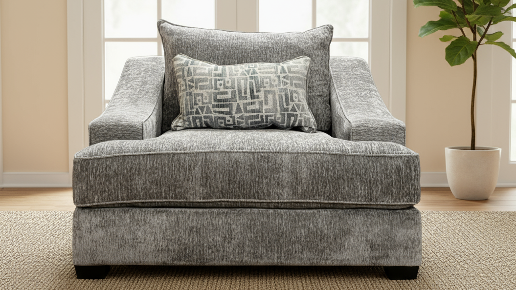 Relájese en un lujoso confort con este espacioso sillón fabricado en Estados Unidos con tapicería de felpa gris y un elegante cojín estampado. Su generoso tamaño garantiza una amplia relajación y apoyo.
