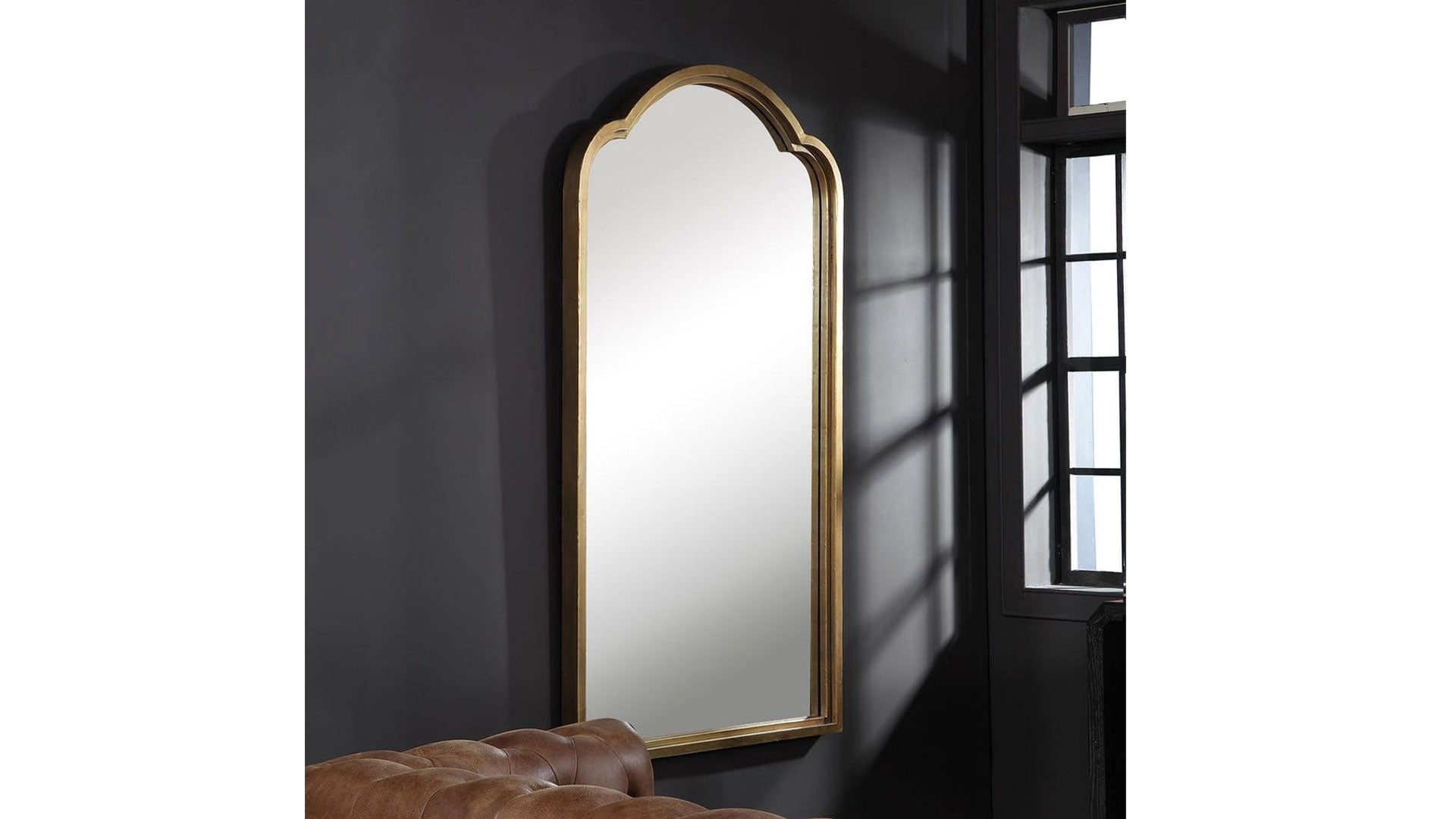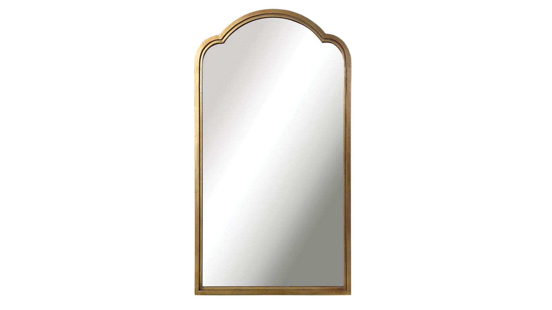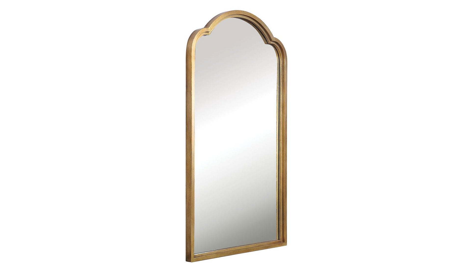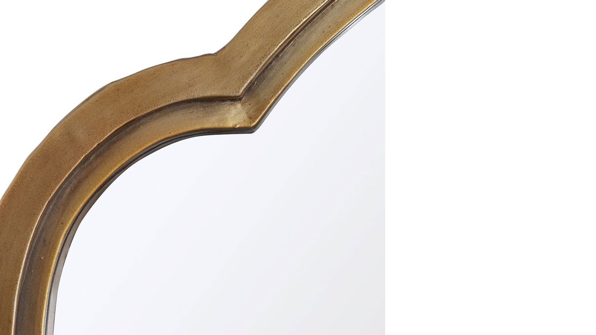 Las elegantes líneas curvas se realzan con este pesado marco de espejo de hierro, que presenta un llamativo marco doble escalonado con un acabado dorado metálico ligeramente deslustrado.
