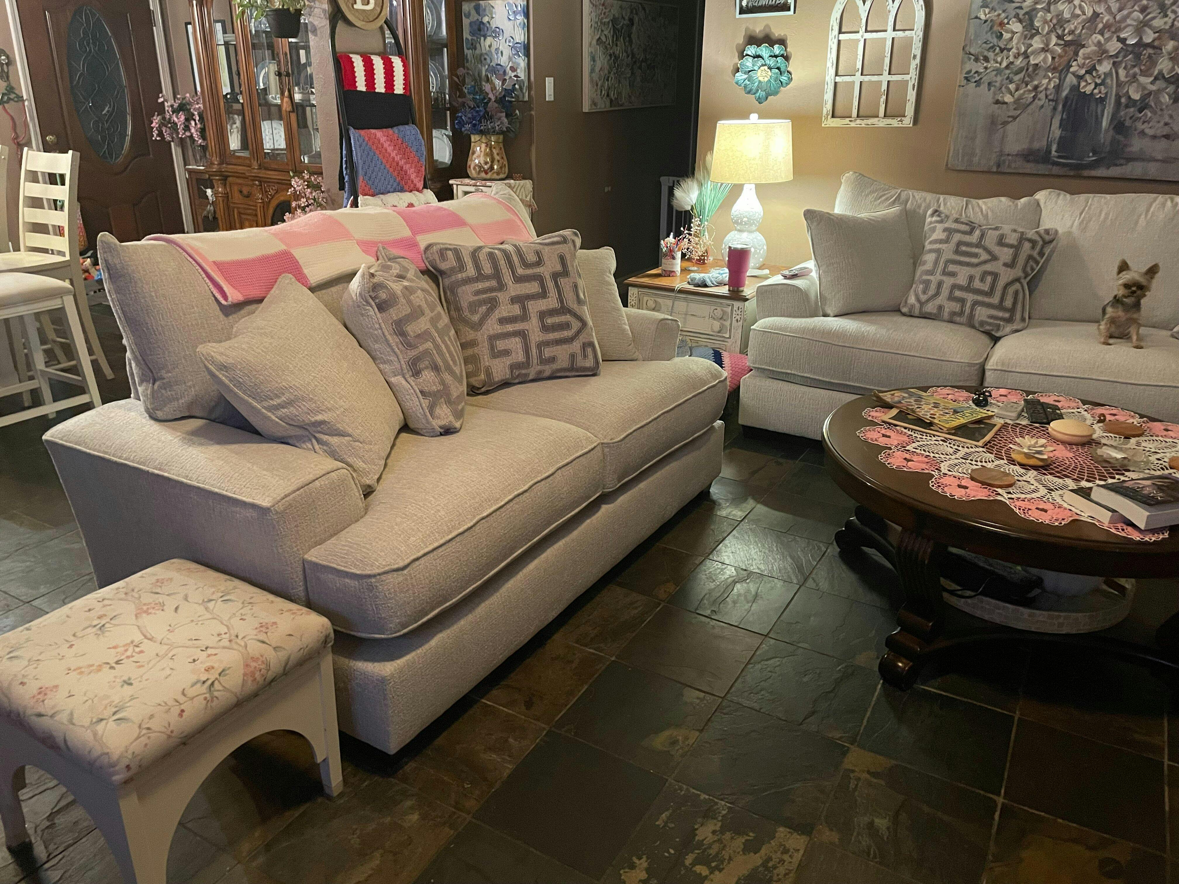 Fabricado en EE.UU., este sofá de dos plazas combina comodidad, durabilidad y estilo en un tamaño versátil que resulta perfecto por sí solo o combinado con el sofá a juego. Tapizado en tela suave y texturizada, cuenta con cojines de asiento y respaldo de felpa para la relajación diaria. Para completar el look, el sofá de dos plazas incluye cuatro cojines decora tivos en una mezcla de diseños sólidos y estampados, que añaden comodidad y un toque decorativo.