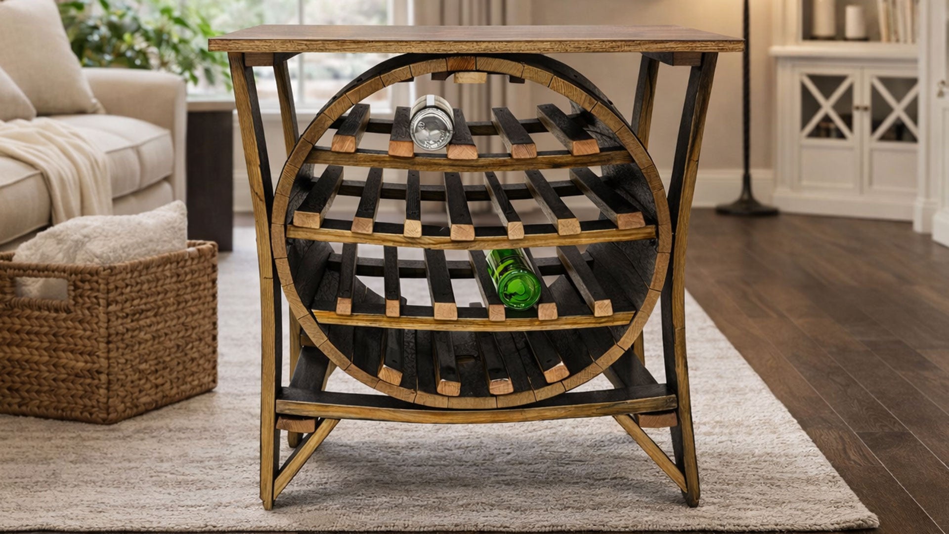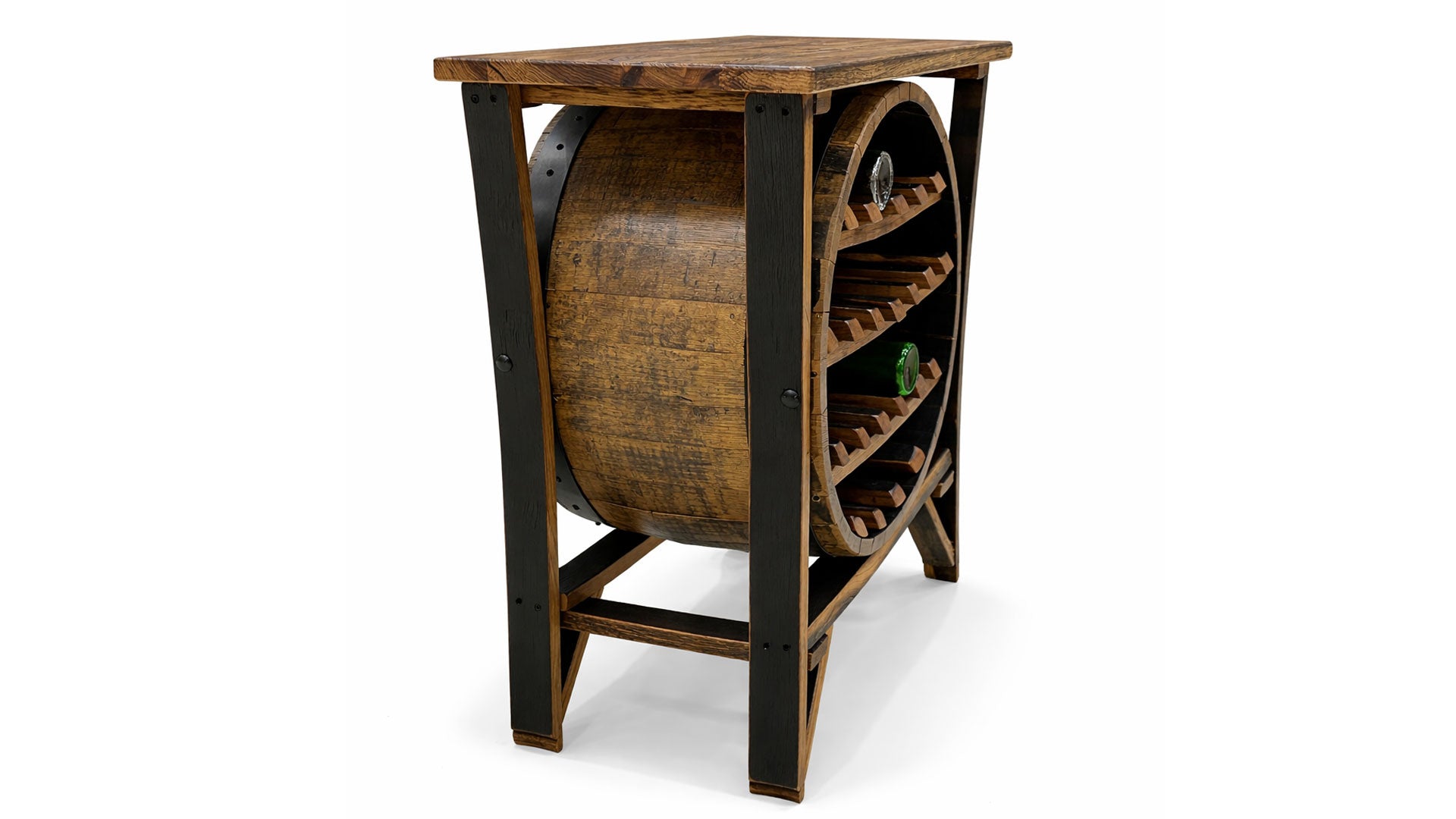 Botellero grande de madera maciza con forma de barril en nogal quemado