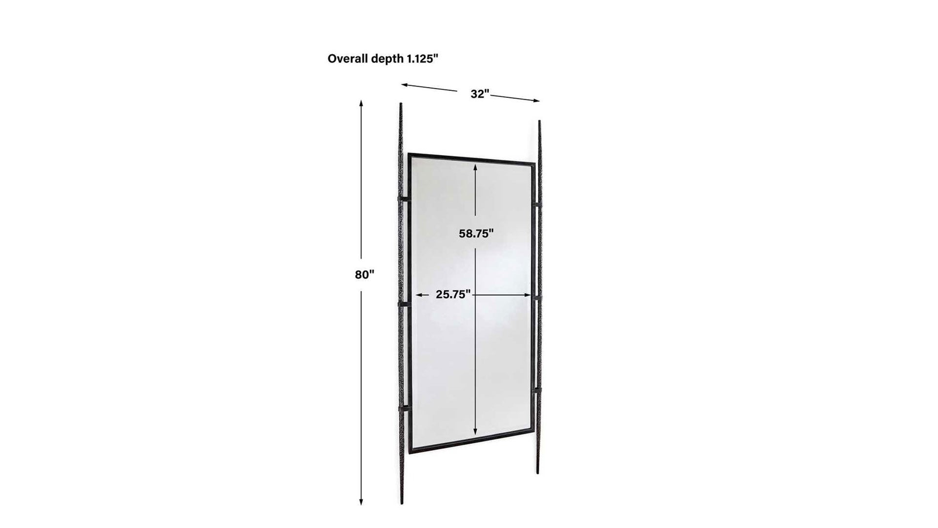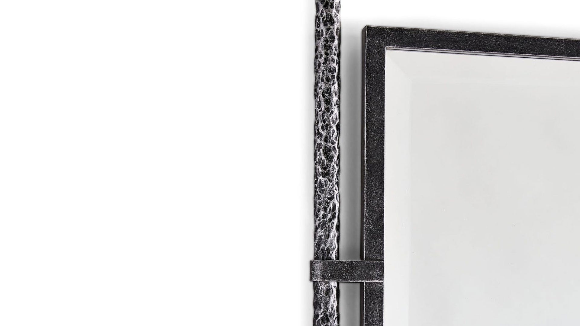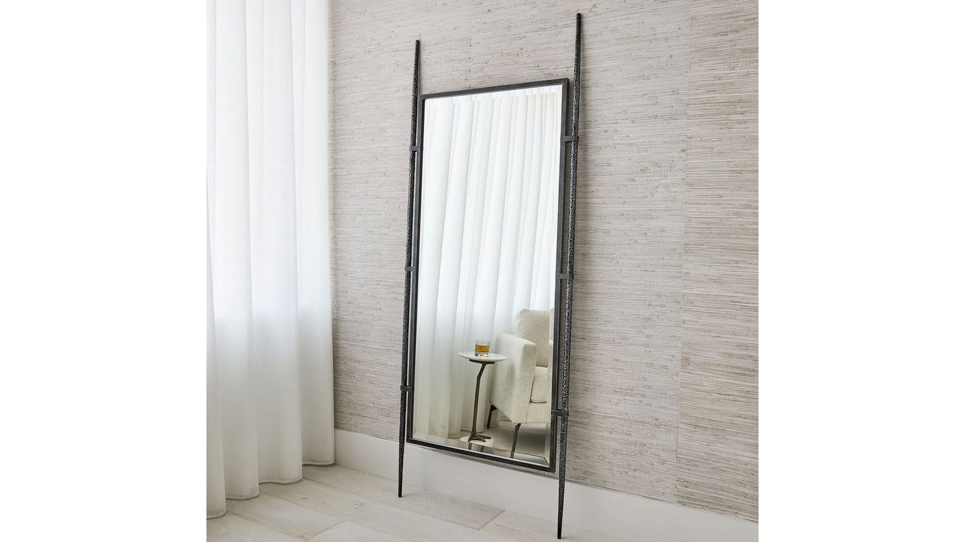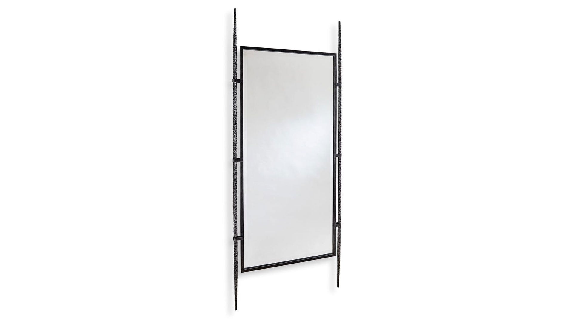 El marco central de acero está suspendido entre dos patas texturizadas forjadas a mano. El espejo tiene un generoso bisel de 1,25 pulgadas. Se puede colgar o apoyar contra la pared utilizando el kit antideslizante incluido.