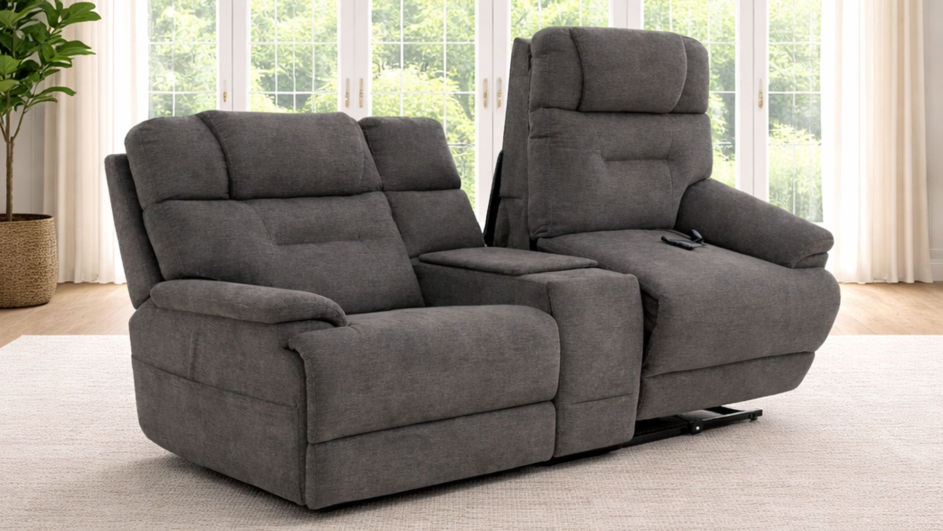 Sofá de dos plazas MacZcliner en color gris umbra, modelo P5, con elevación asistida doble y consola