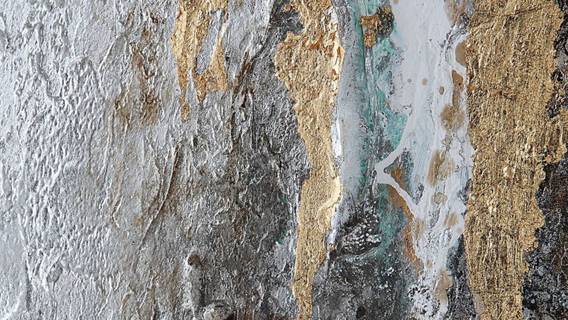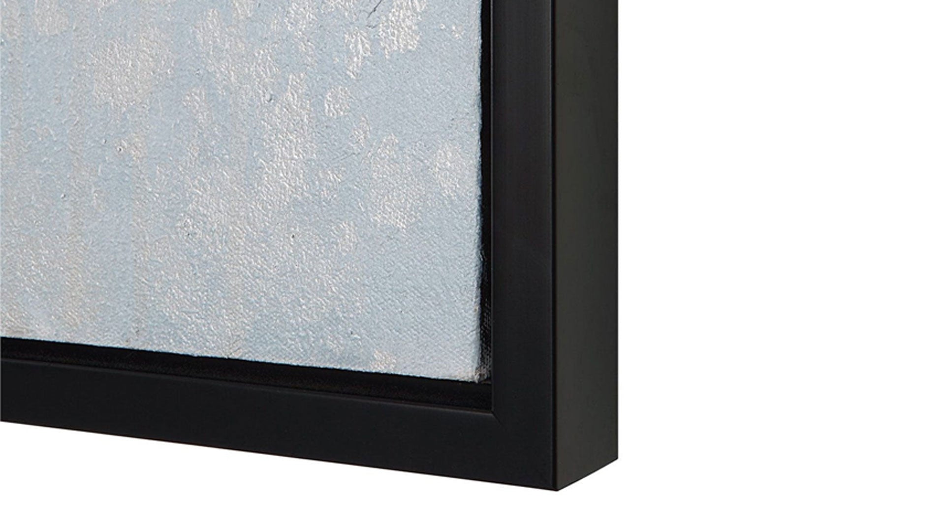 La pintura a mano Mountain Mist muestra un hermoso equilibrio entre tonos suaves y atrevidos. Enmarcada al estilo galería flotante en un marco negro satinado con una paleta abstracta de colores aguamarina, carbón y blanco, acentuada por pan de oro y plata. Se puede colgar en horizontal o en vertical.