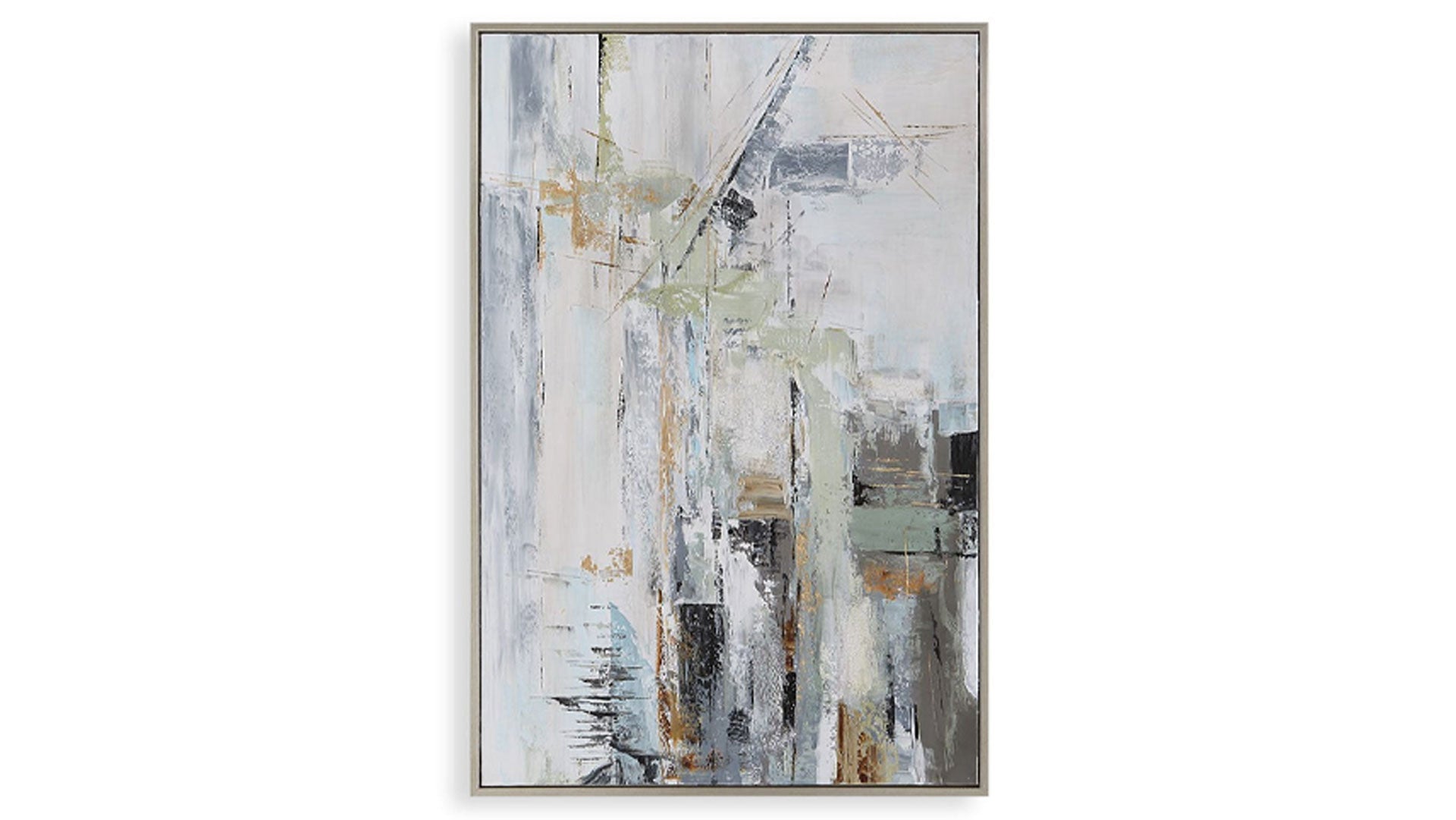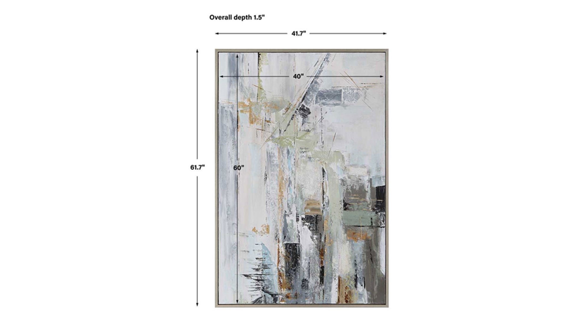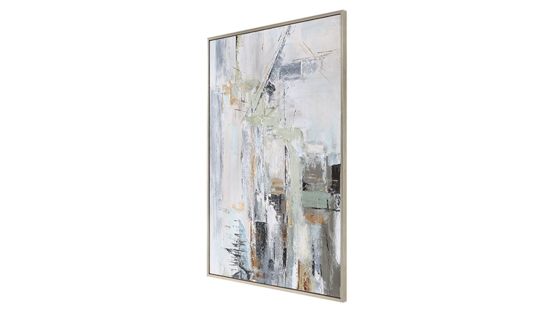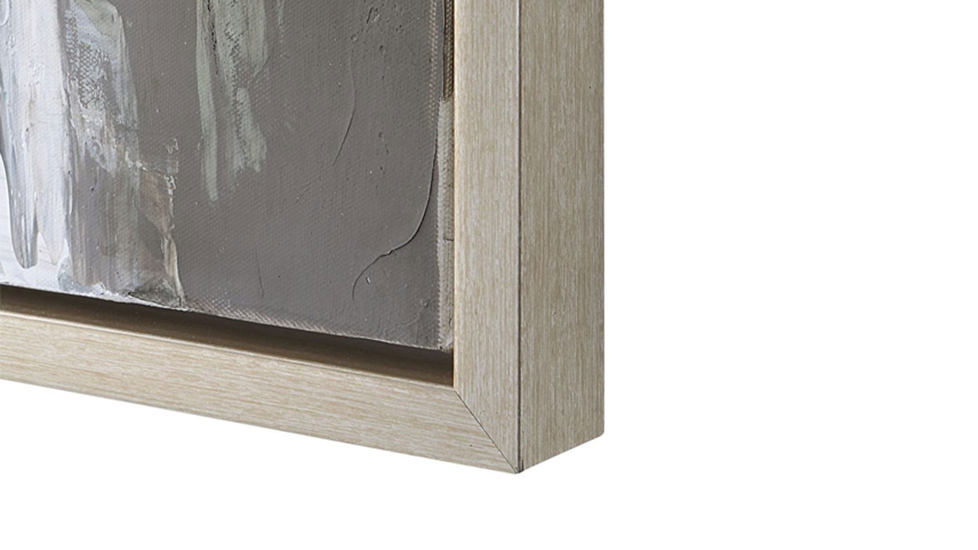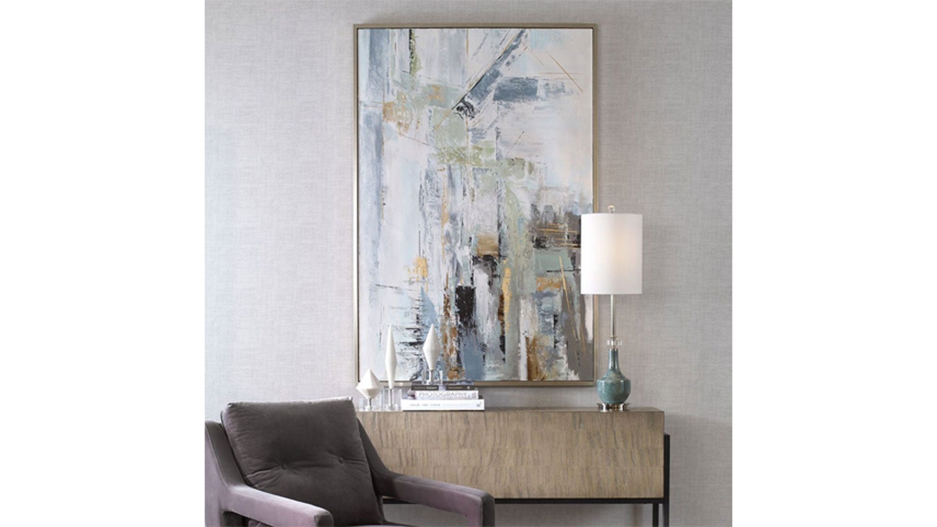 La obra de arte pintada a mano Natural Springs combina elementos angulares modernos con una paleta de colores fríos y apagados. El suave lienzo en tonos salvia, azul y neutros se ve realzado por una textura craquelada aplicada a mano y sutiles detalles en pan de oro, enmarcado en un marco de galería en pan de plata. Se puede colgar en horizontal o en vertical.