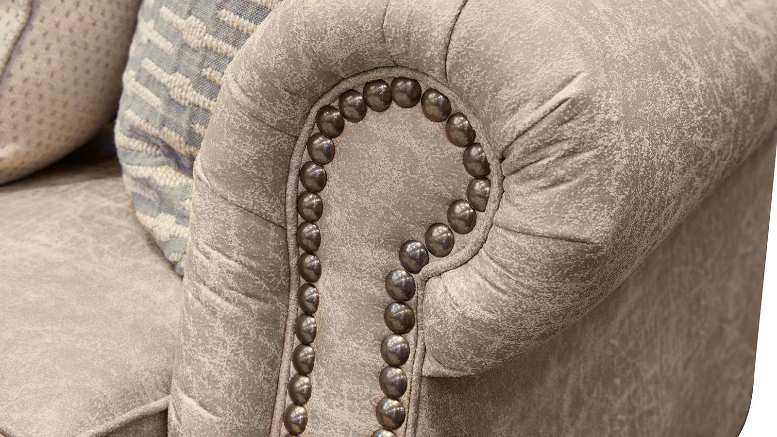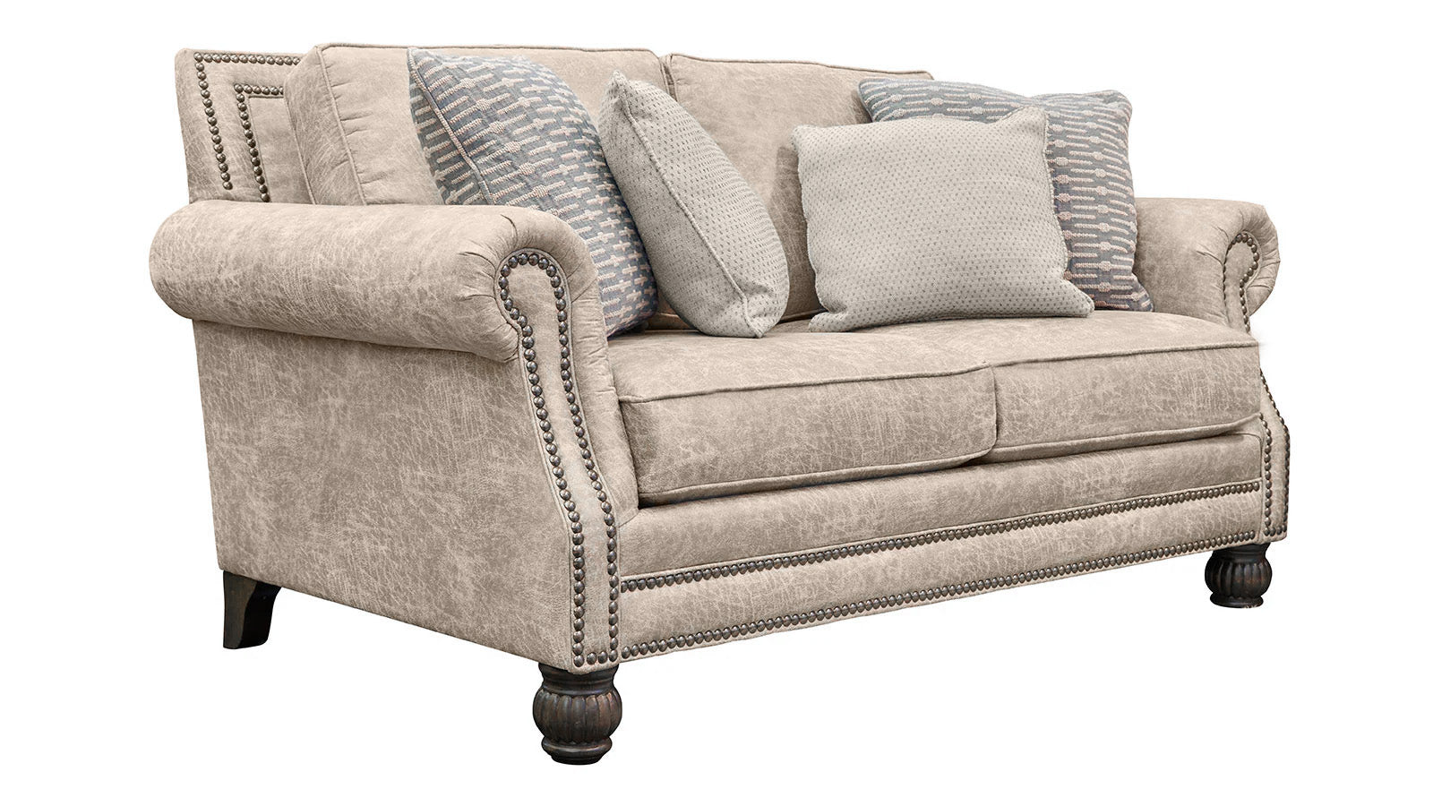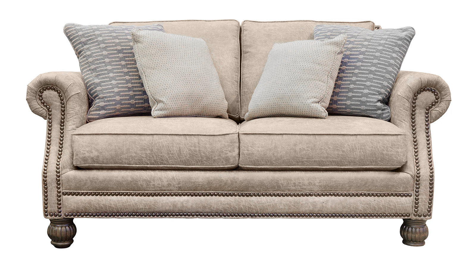 Este sofá de dos plazas realzará cualquier salón. Su color beige encaja en cualquier estilo, y sus gruesos cojines de asiento se asegurará de que usted y sus invitados podrán sentarse en la altura de la comodidad y el estilo. También cuenta con cabezas de clavos de latón antiguo a lo largo de los brazos y la parte inferior, lo que acentúa el diseño. Si está interesado en comprarlo, Gallery Furniture le ofrece entrega en el mismo día y opciones de financiamiento.