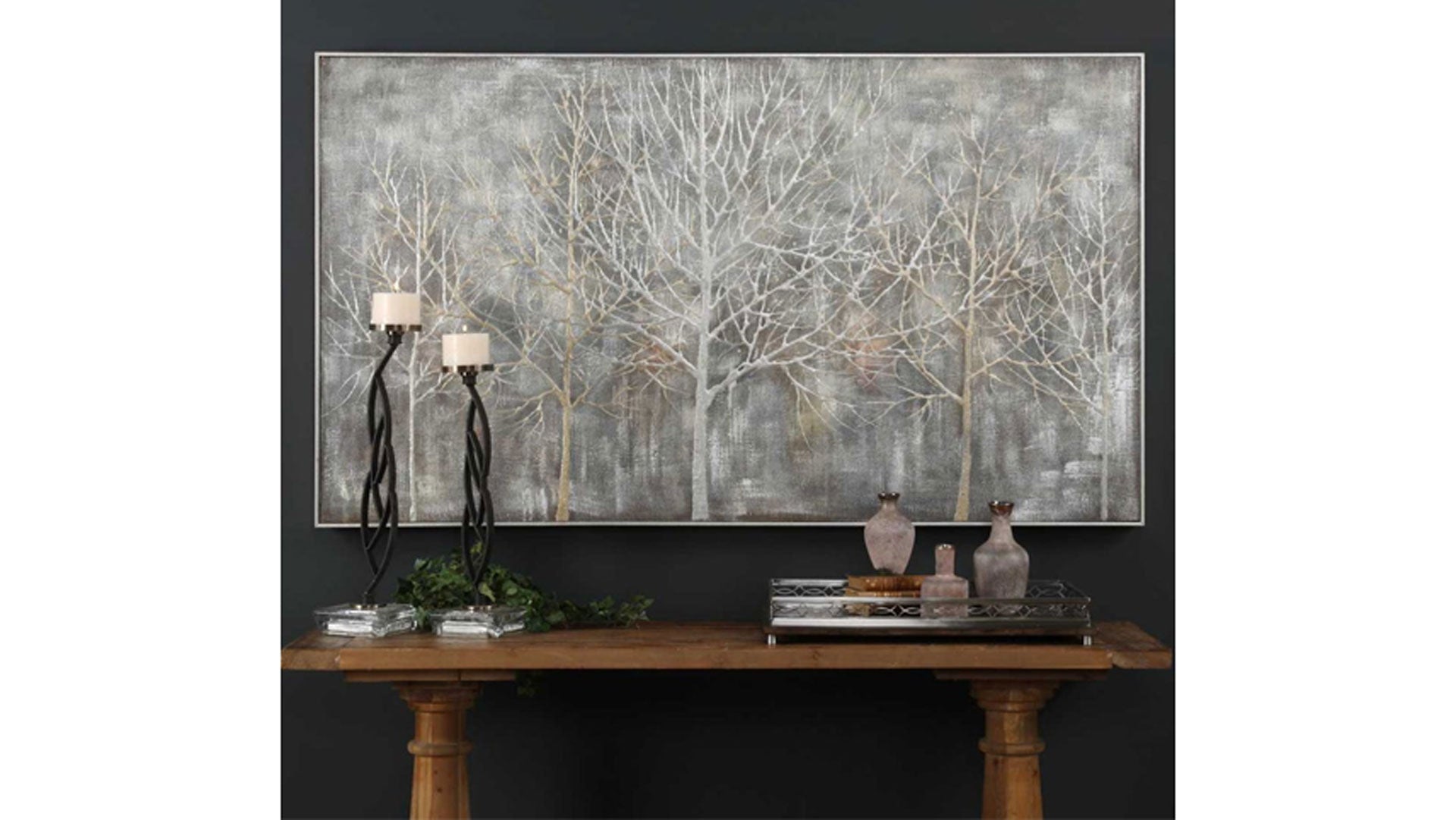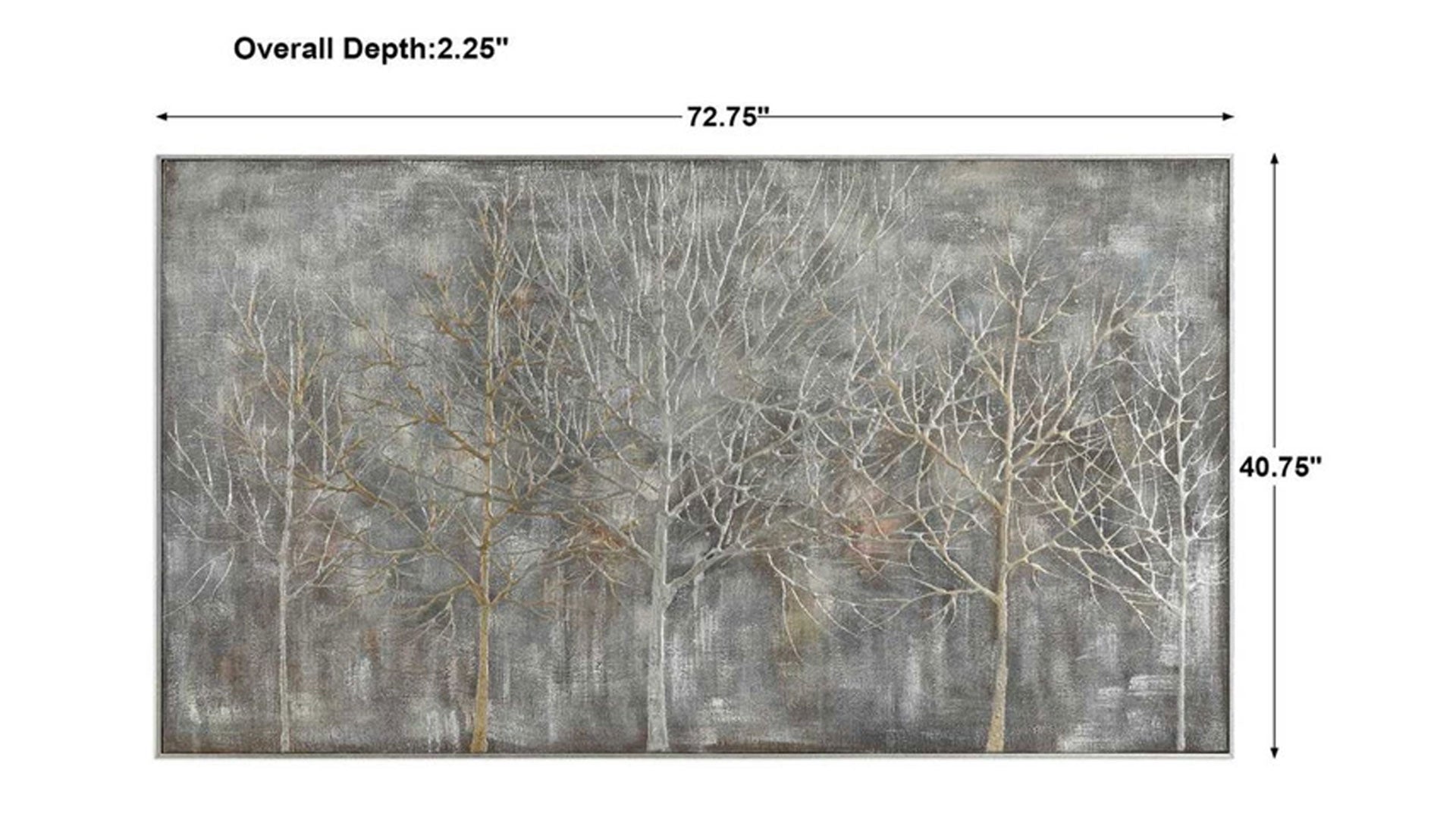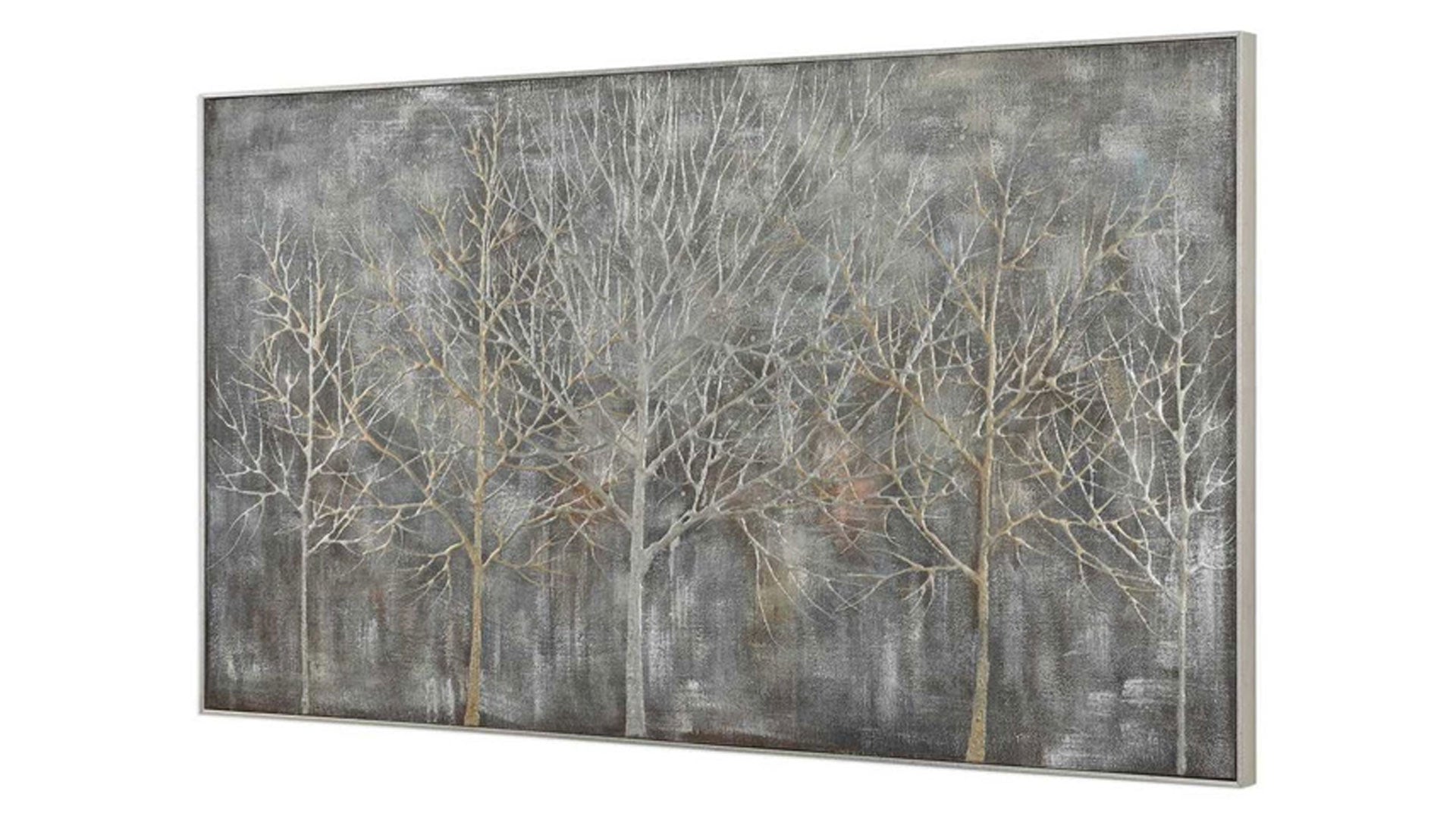 De diseño contemporáneo, este paisaje pintado a mano sobre lienzo presenta acentos muy texturizados, que crean un efecto tridimensional en relieve. Los tonos grises, dorados y plateados forman una paleta de colores versátil y neutra. Cada lienzo está tensado y fijado a bastidores de madera y rodeado por un pequeño marco de galería en plata champán. Debido a la naturaleza artesanal de esta obra de arte, cada pieza puede presentar sutiles diferencias.