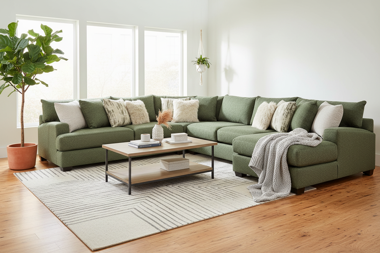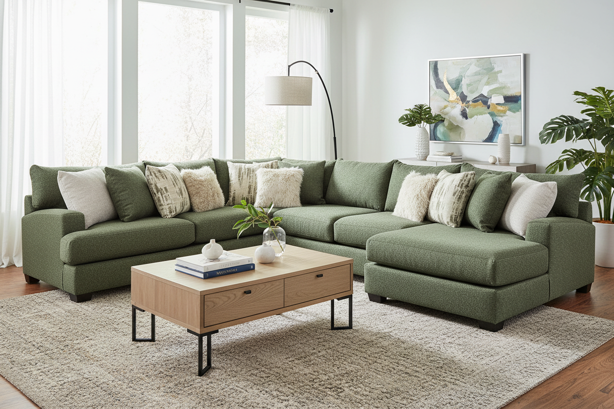 Sofá modular Rio Spinach de 4 piezas en color verde con chaise longue a la derecha - Tejido de alto rendimiento Worry-Free - Fabricado en Houston