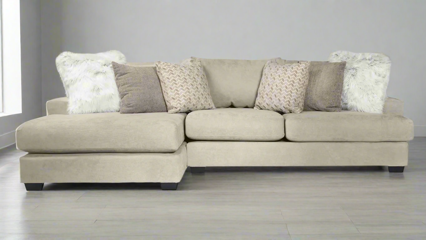 El Sensation Crema Brazo Izquierdo (LAF) Chaise Chofa de Gallery Furniture ofrece un estilo moderno y un lujoso confort para su hogar. Tapizado en tela de color crema suave y duradero, este seccional aporta elegancia y comodidad a cualquier espacio de vida. Con su amplio brazo izquierdo frente a la chaise, esta pieza es perfecta para descansar, relajarse o entretener a los invitados. También viene con cojines de felpa y seis almohadas a juego para mejorar la comodidad y añadir un toque de estilo.