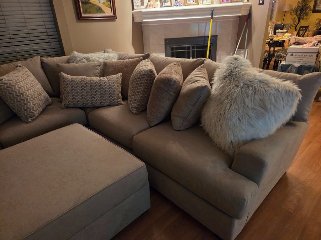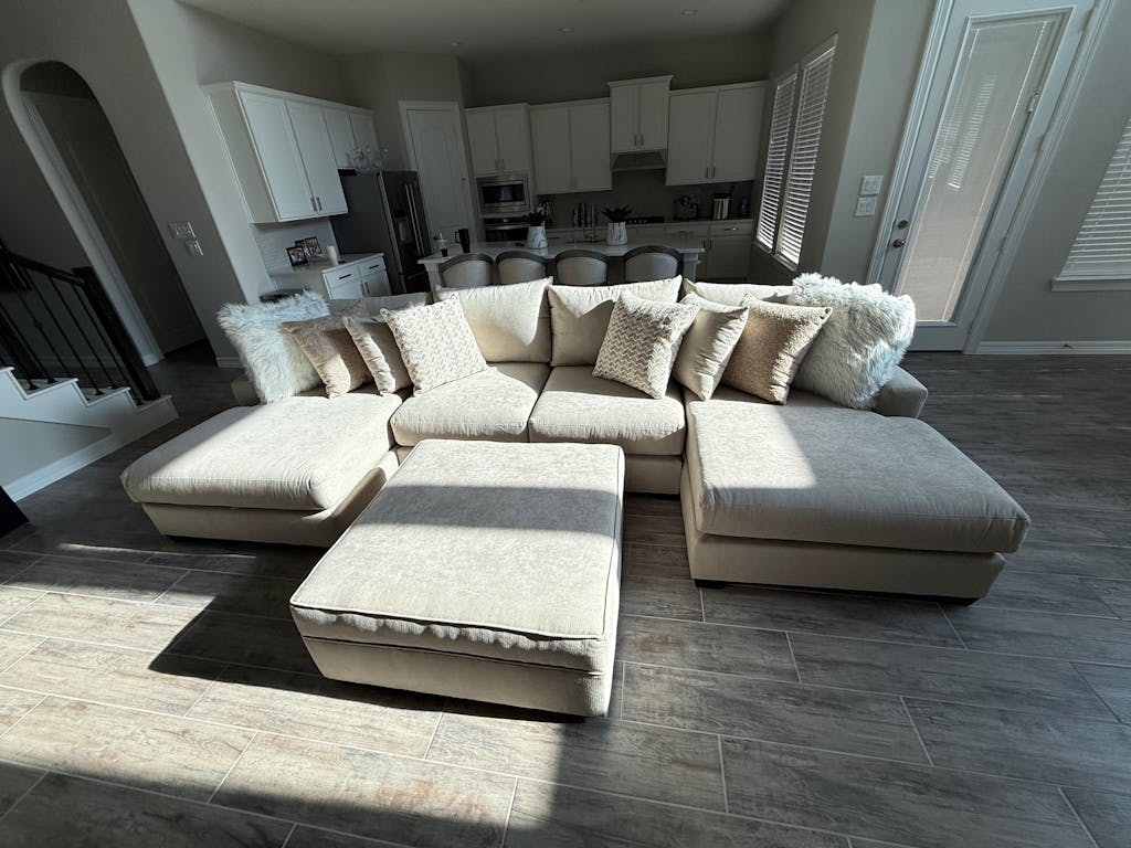 Convierta la comodidad en el centro de su hogar con este acogedor sofá seccional modular de 3 piezas. Fabricado con orgullo en los EE. UU., esta espaciosa opción de asiento incluye dos extremos de chaise longue y ocho cojines decorativos de felpa, que combinan el estilo moderno con una relajación duradera.