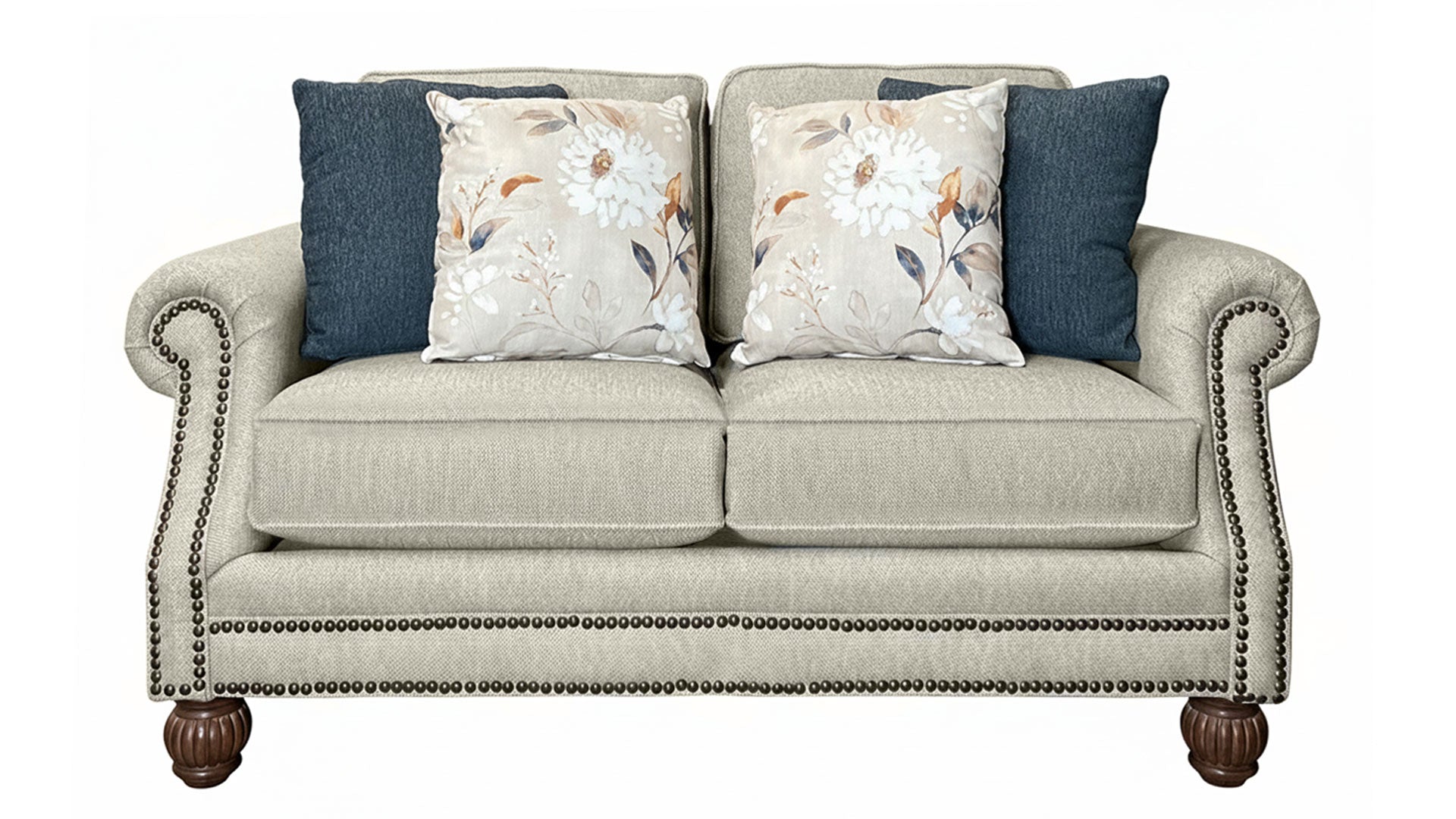 - Los brazos enrollados y el ribete con cabeza de clavo realzan un detalle atemporal