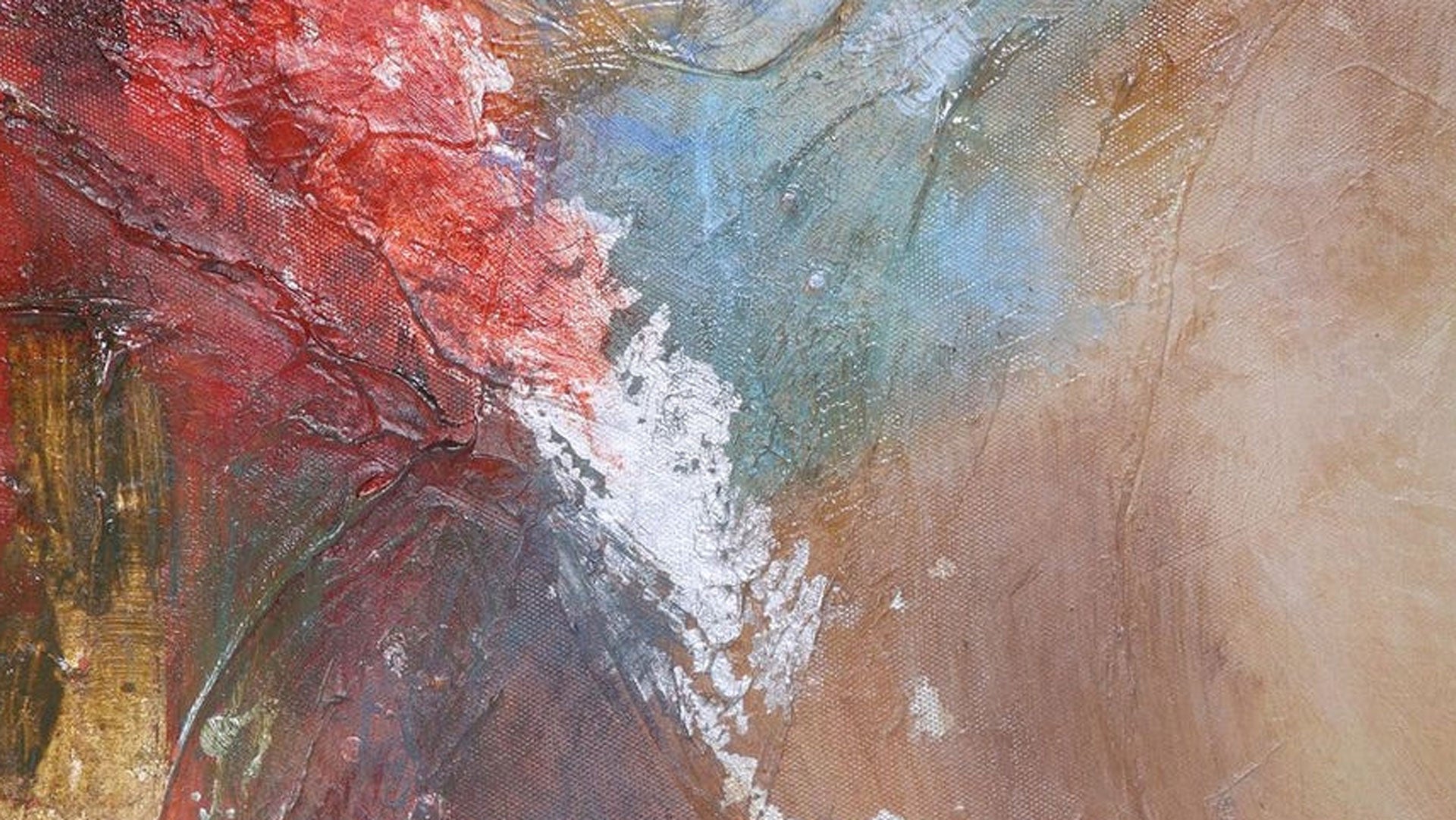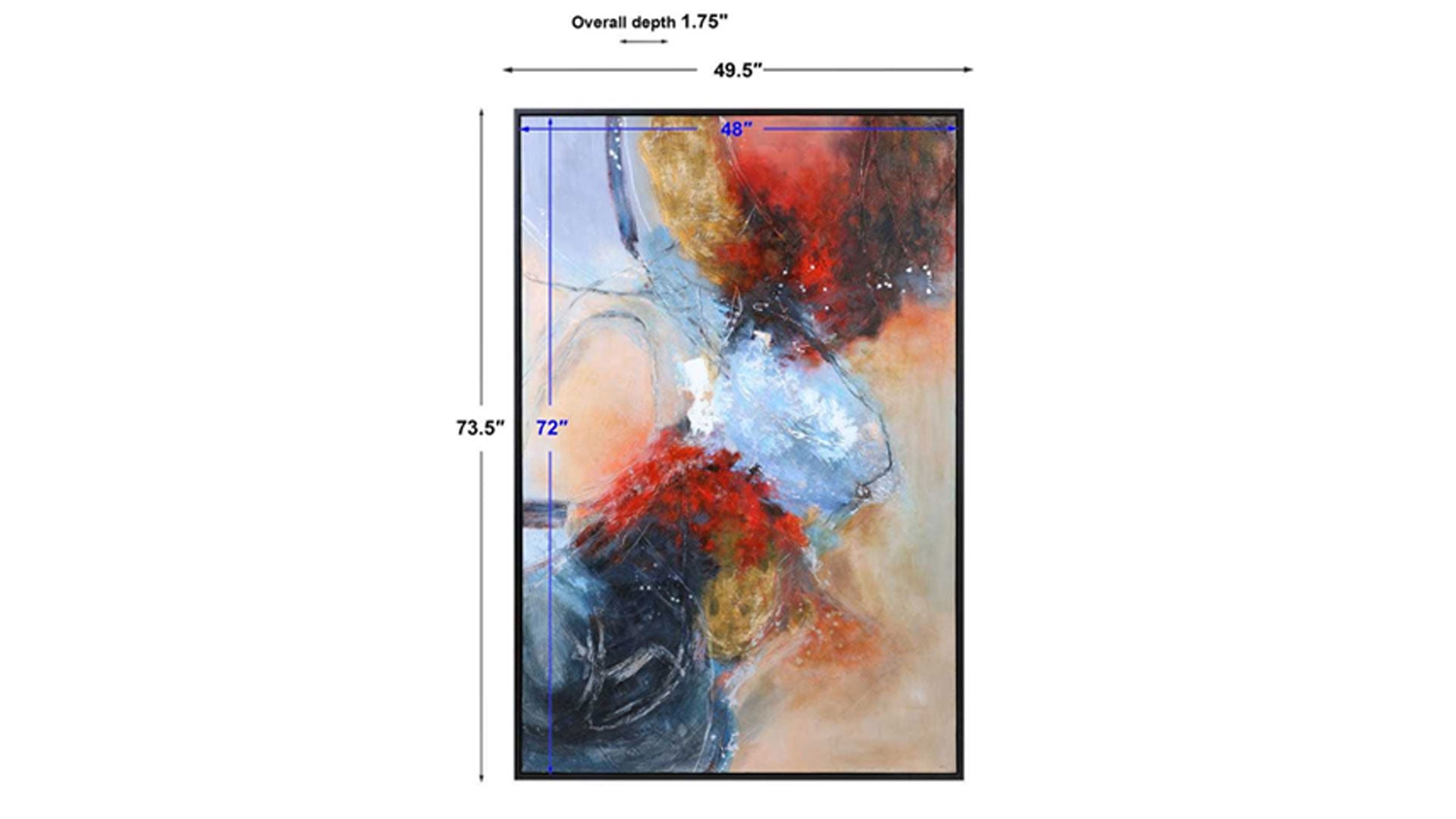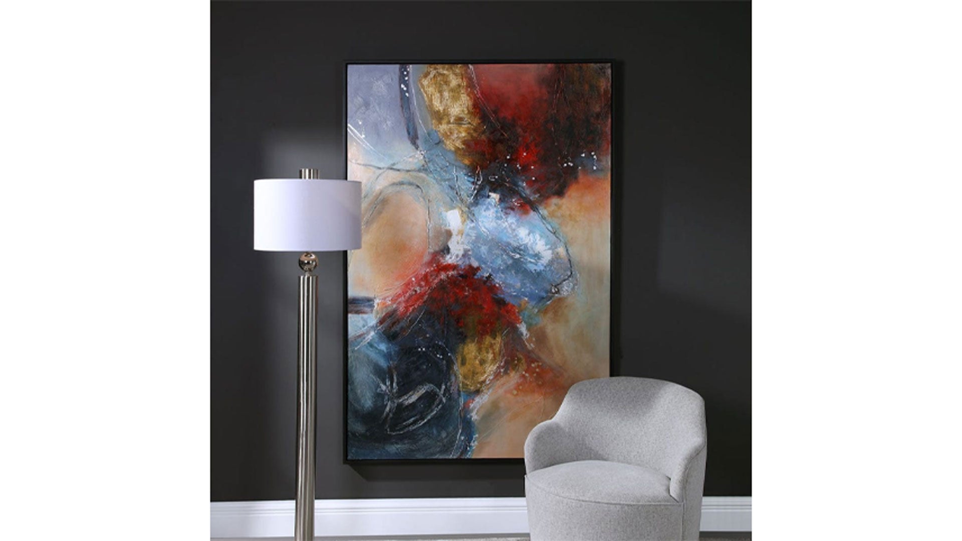 Pintada a mano sobre lienzo, esta obra de arte abstracta presenta ricos tonos rojos y azules profundos con reflejos plateados y dorados, y un marco negro mate. Debido a la naturaleza artesanal de esta obra, cada pieza puede presentar ligeras diferencias. Esta pieza se puede colgar en horizontal o en vertical.