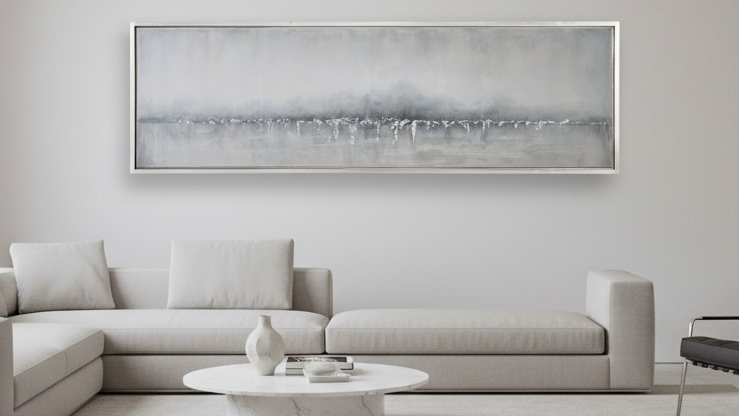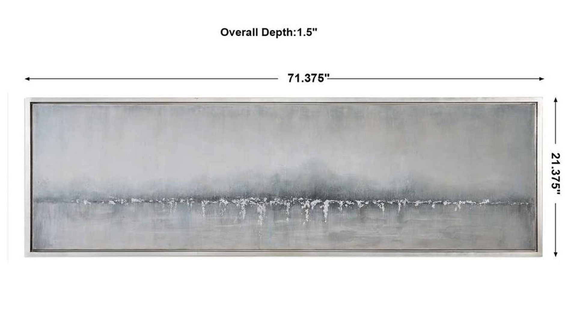 Pintada a mano sobre lienzo, esta obra de arte abstracta trasciende múltiples estilos de diseño. Una versátil paleta de colores, compuesta por gris claro, crema y azul hielo, se complementa con detalles en pan de plata. El lienzo se tensa y se aplica a bastidores de madera antes de ser enmarcado con un marco de galería en pan de plata. Debido a la naturaleza artesanal de esta obra de arte, cada pieza puede presentar sutiles diferencias.