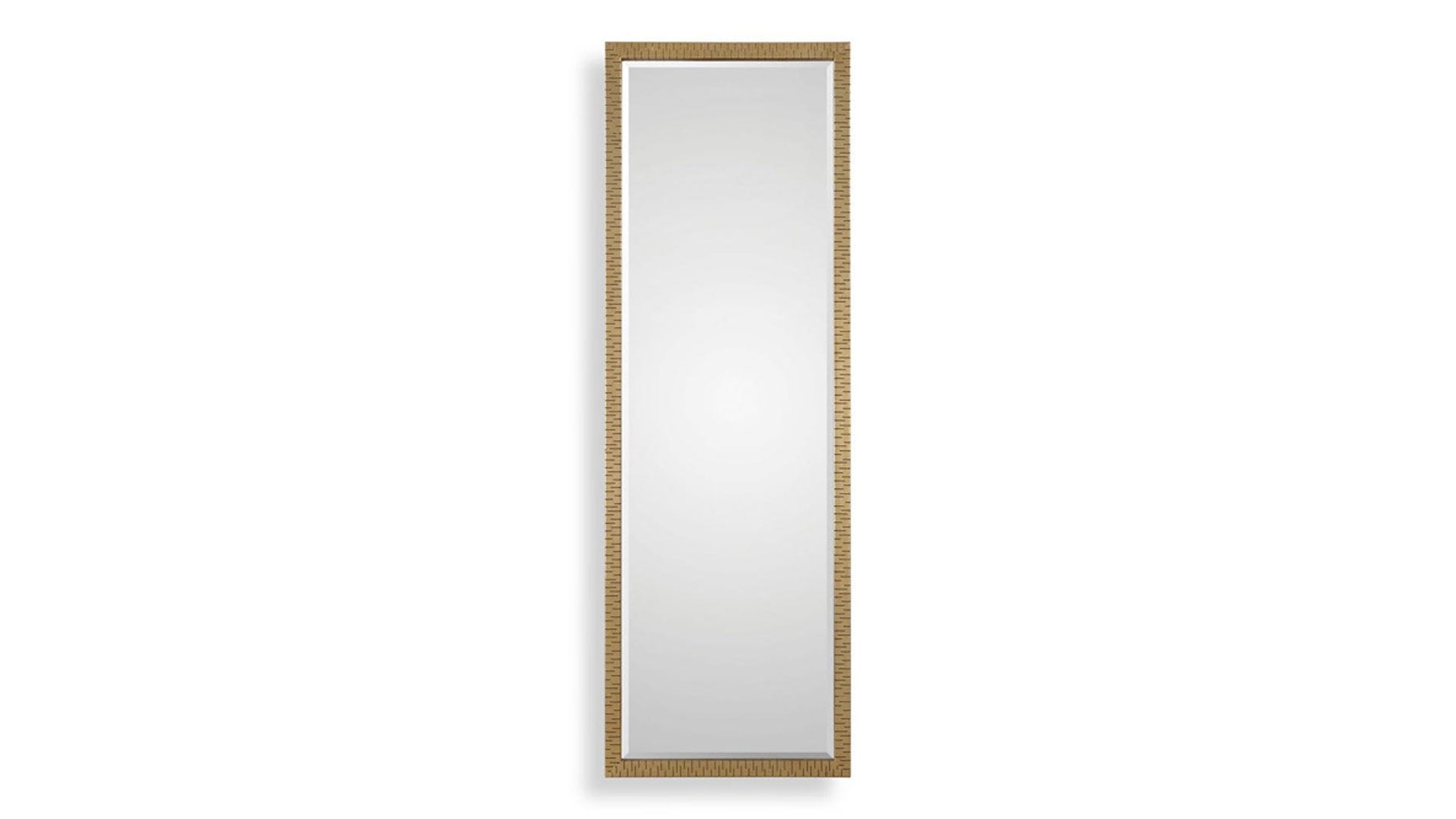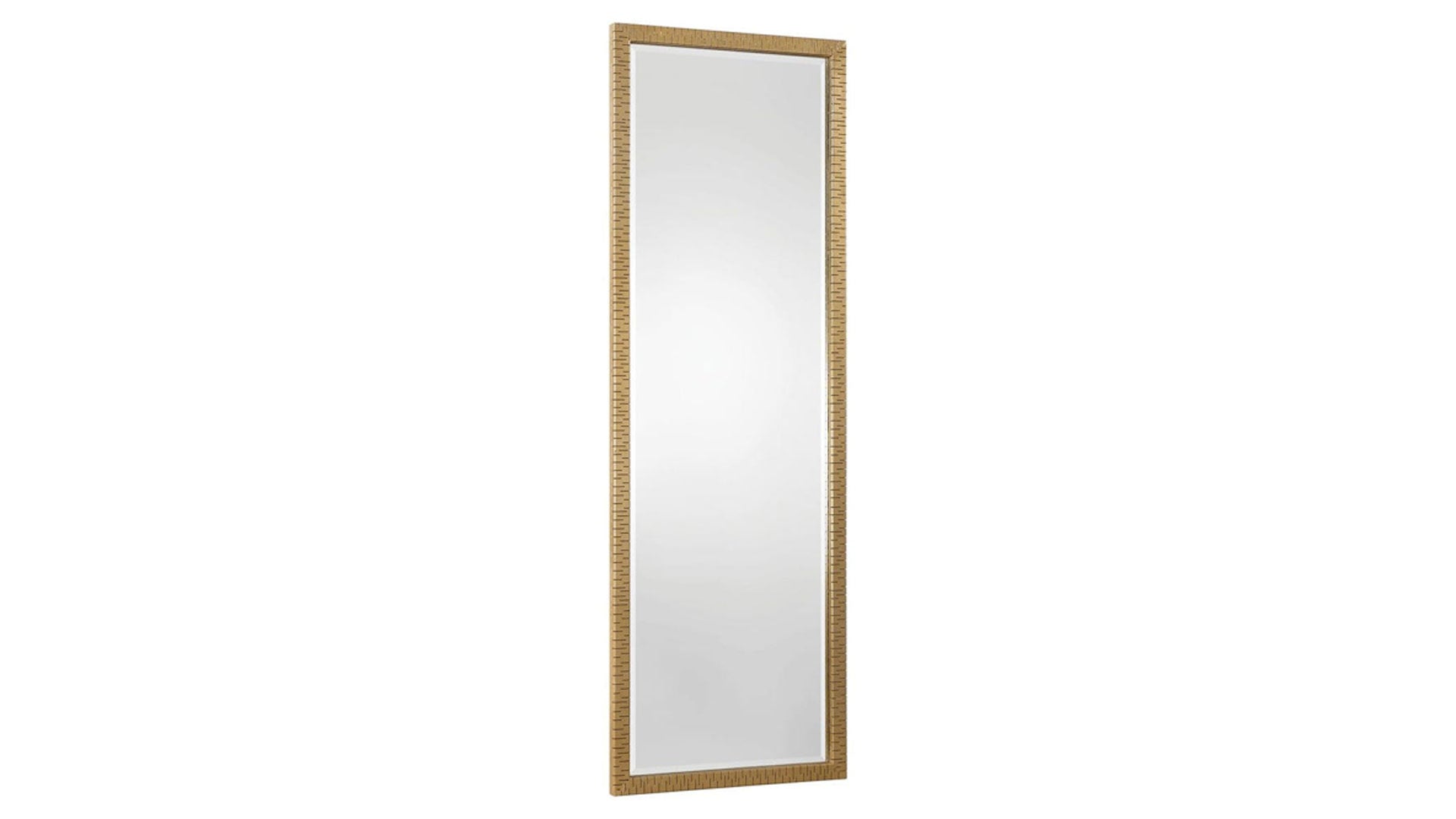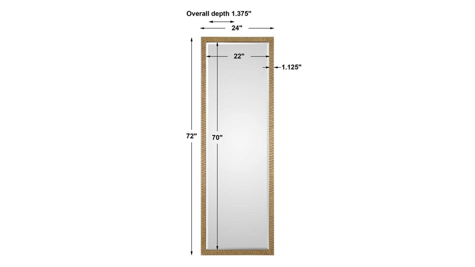 El espejo Vilmos Linear aporta una textura moderna y atrevida y una elegancia refinada a cualquier espacio. Su grueso marco de hierro presenta ranuras alternas cortadas con láser, con un acabado en pan de oro metálico ligeramente envejecido que le confiere un aspecto cálido y dimensional. Un generoso espejo biselado de 1 1/4" añade profundidad y claridad. Diseñado para ser versátil, este espejo se puede colgar en horizontal o en vertical.