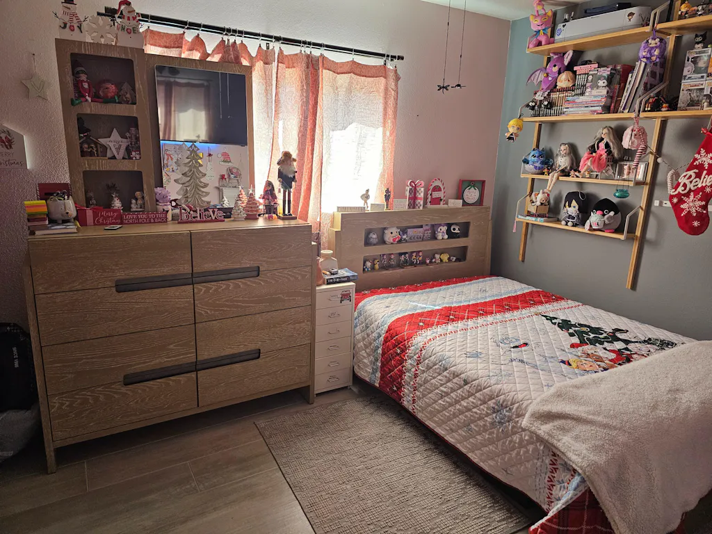 "Eleve el dormitorio de su hijo con lo último en elementos esenciales para niños: la cama Twin Panel con acabado en roble envejecido. Esta impresionante pieza está expertamente elaborada para combinar funcionalidad y estilo. El cabecero cuenta con estanterías empotradas que proporcionan un espacio práctico para libros, juguetes o artículos esenciales para la hora de dormir, mientras que la iluminación LED multicolor integrada crea el ambiente perfecto para relajarse o estudiar. Incluye mando a distancia. Con sus líneas limpias y su aspecto moderno, esta cama está diseñada para encajar a la perfección en cualquier decoración contemporánea. El acabado en roble envejecido aporta calidez y carácter a la habitación, convirtiéndola en una mezcla perfecta de estilo y funcionalidad que encantará a niños y padres."