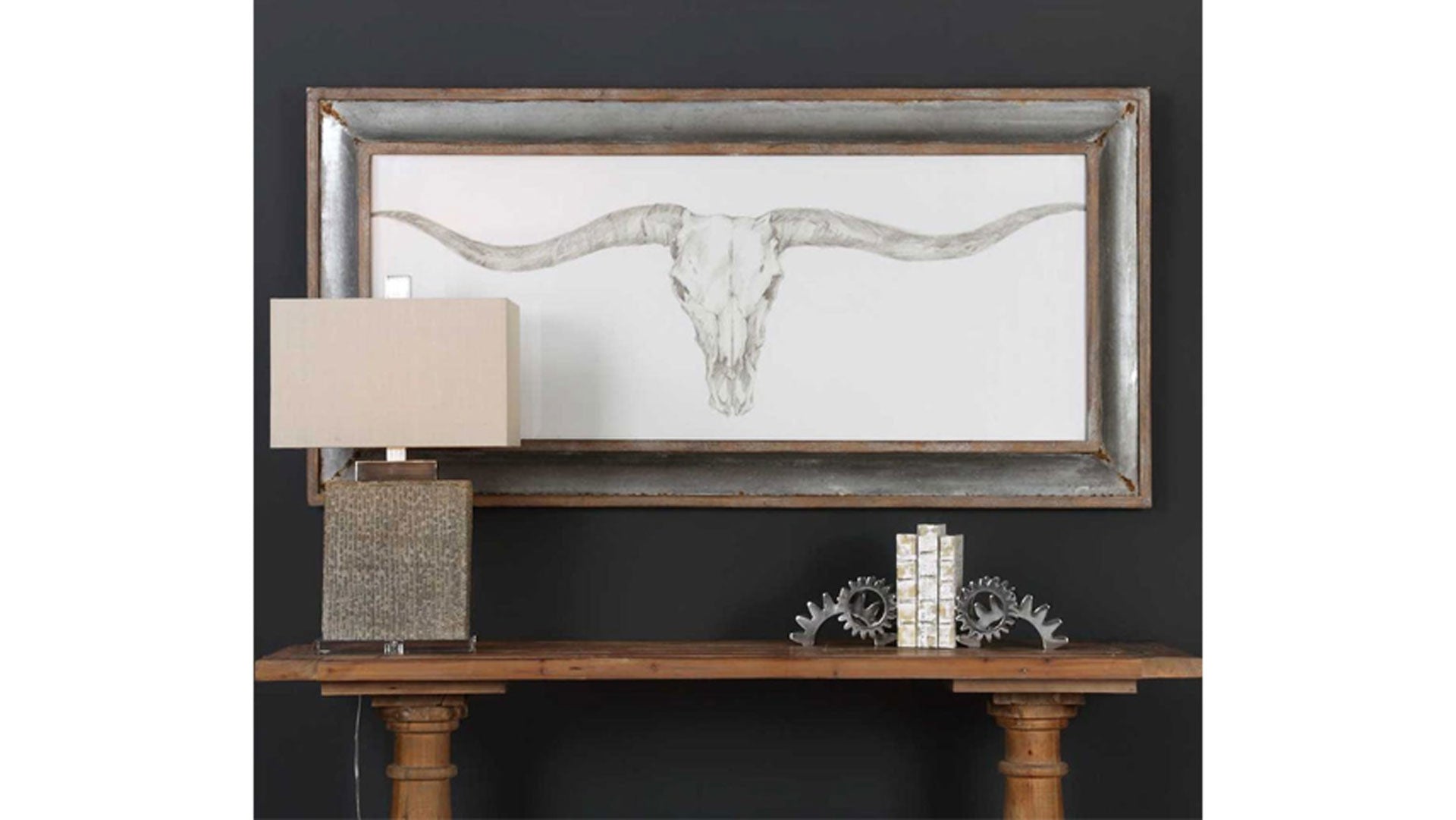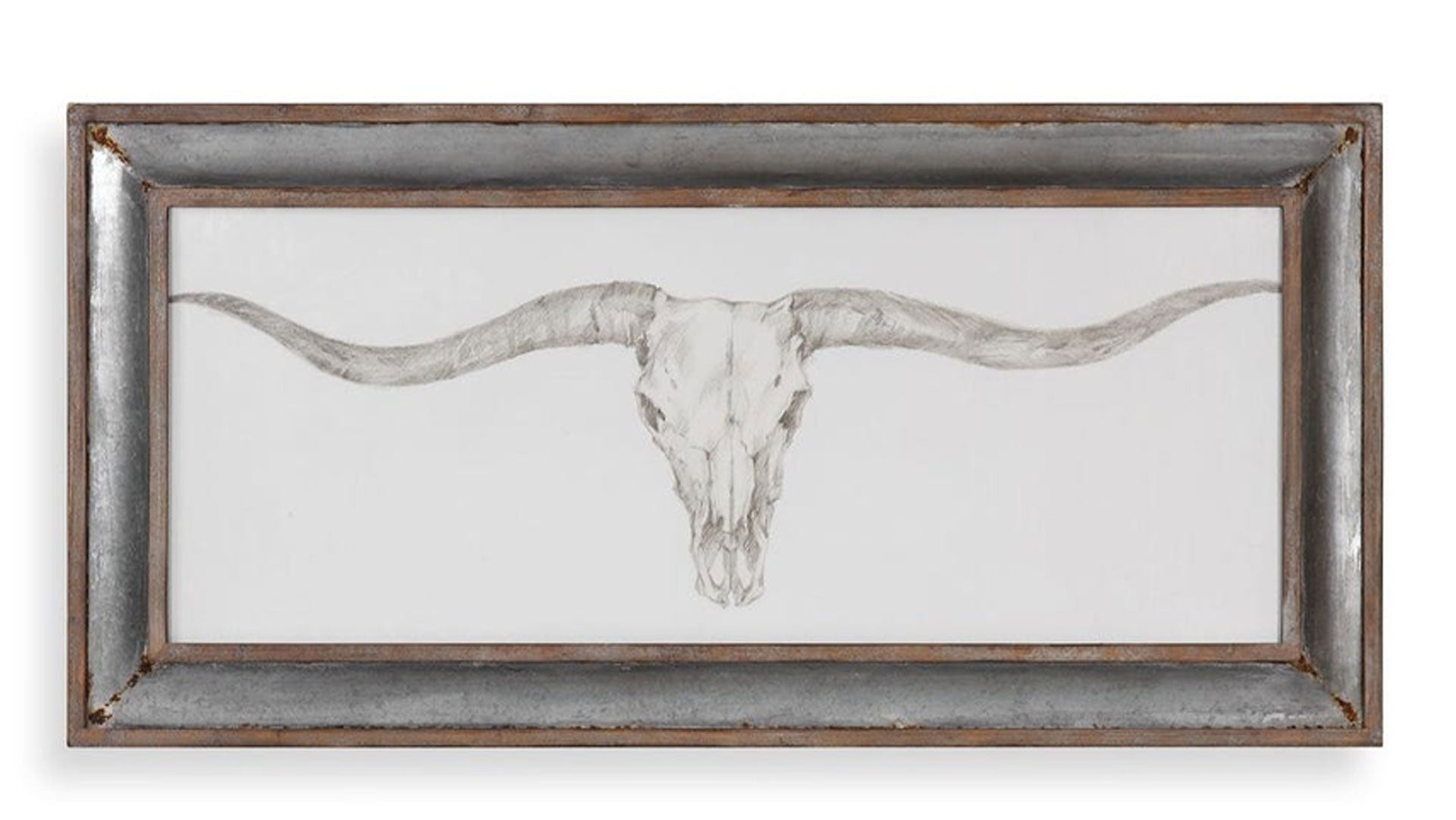 El estilo rústico y occidental irradia de esta obra de arte monocromática enmarcada. Este diseño sencillo y masculino está rodeado por un marco de hojalata galvanizada con detalles oxidados y un marco exterior e interior de madera de granero envejecida. Esta lámina de estilo transicional está protegida por un cristal. Obra de Ethan Harper.