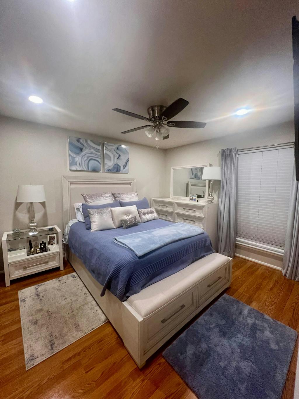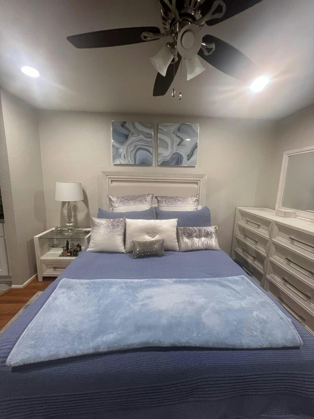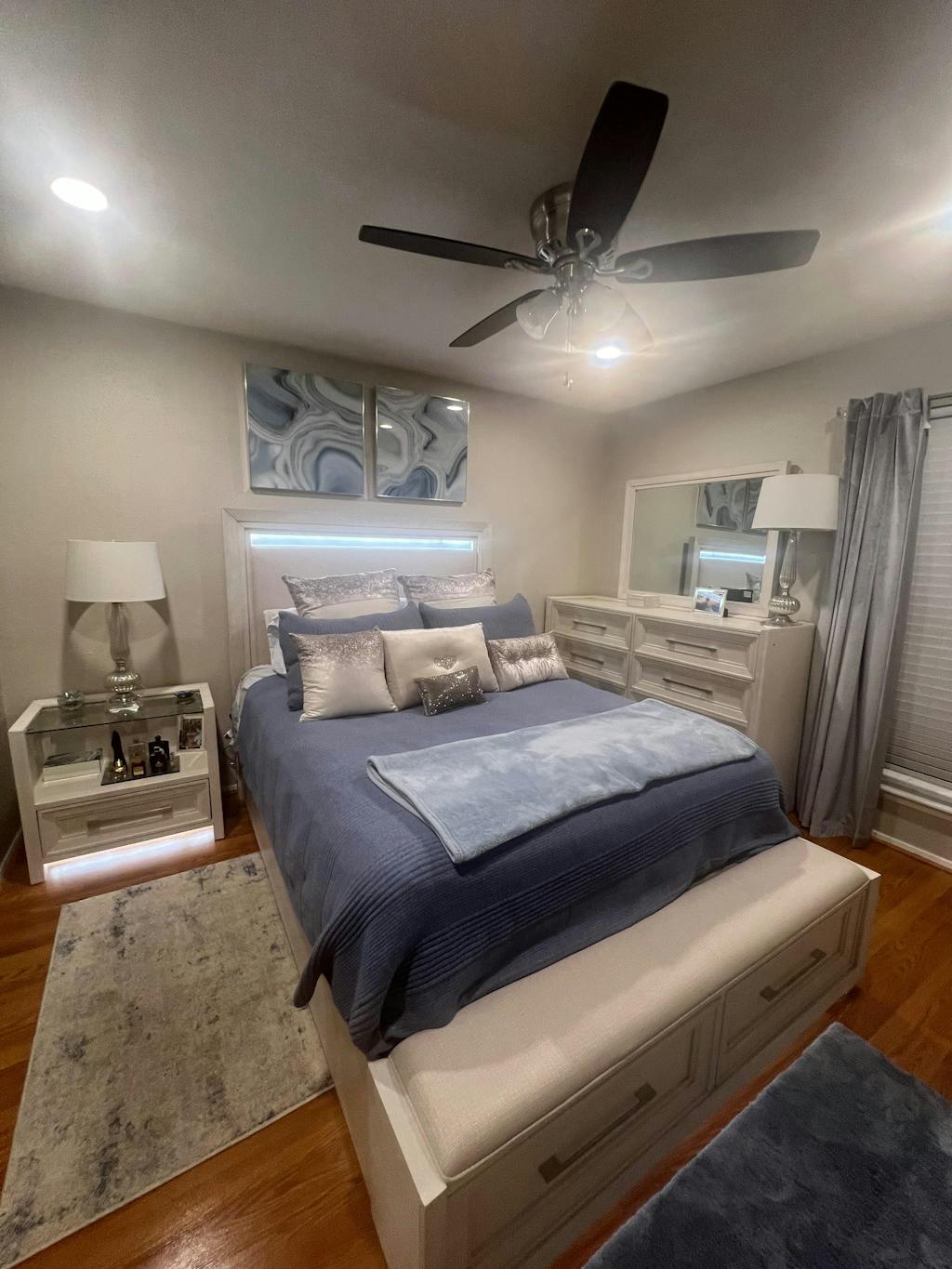 - Pie de cama tapizado tipo banco:Pie de cama tapizado acolchado en color perlacon dos cajones extraíbles y iluminación decorativa inferior.